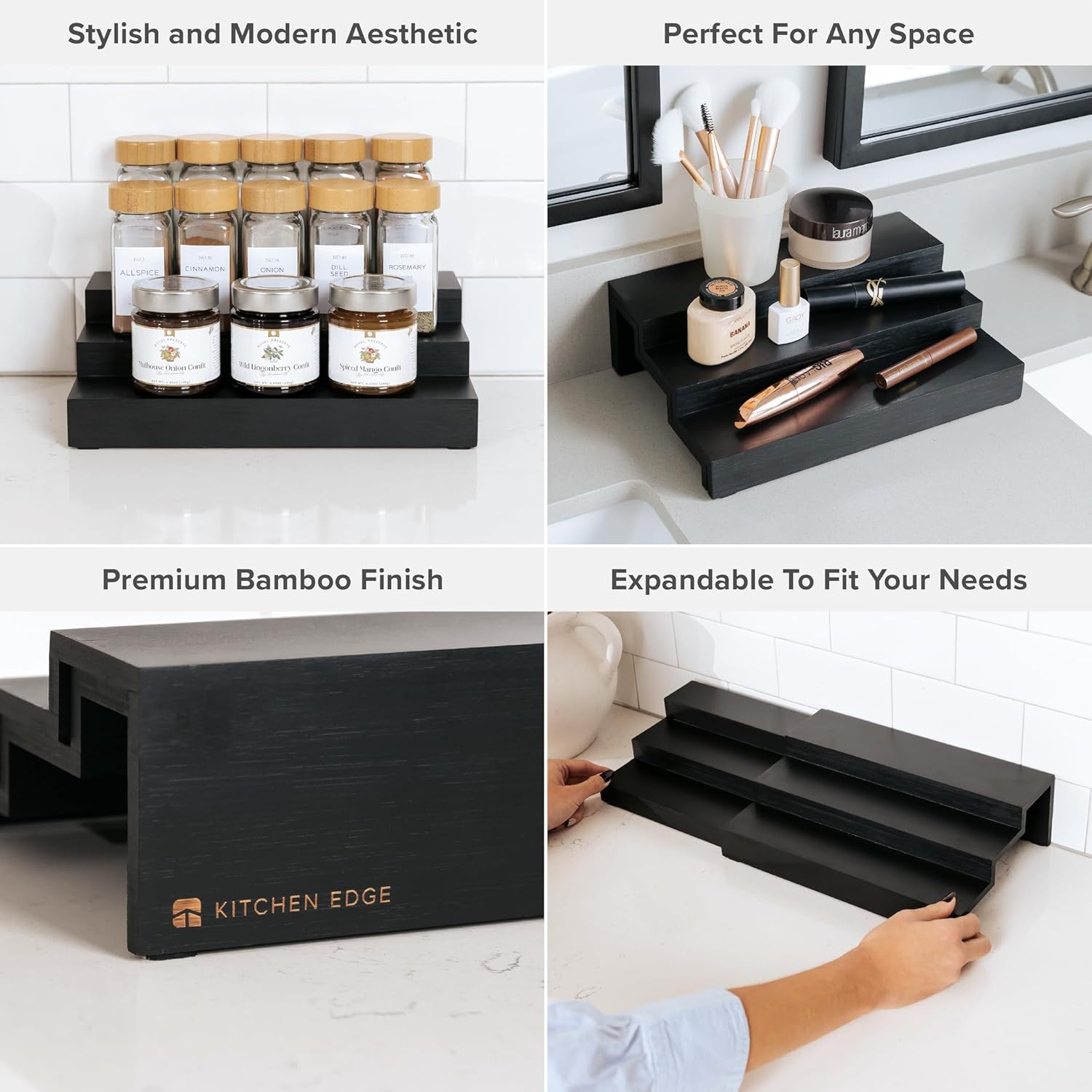 KitchenEdge Expandable Spice Rack Organizer for Cabinet, 3-Tier Shelf for Spice Organization (11” to 22”), Fits 36 Spice Jars, Seasoning and Pantry Storage, Non-Slip Feet, 100% Bamboo, Black Finish