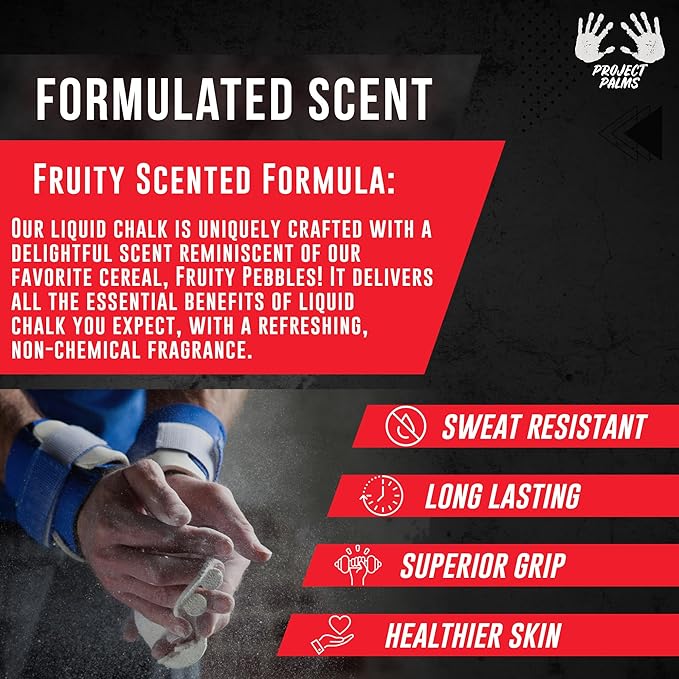 - Fruity cereal scent: Infused with a refreshing fruity cereal fragrance, Project Palms liquid chalk adds an enjoyable aroma to your workout. This unique scent keeps you engaged and enhances your workout experience, whether at the gym or outdoors.