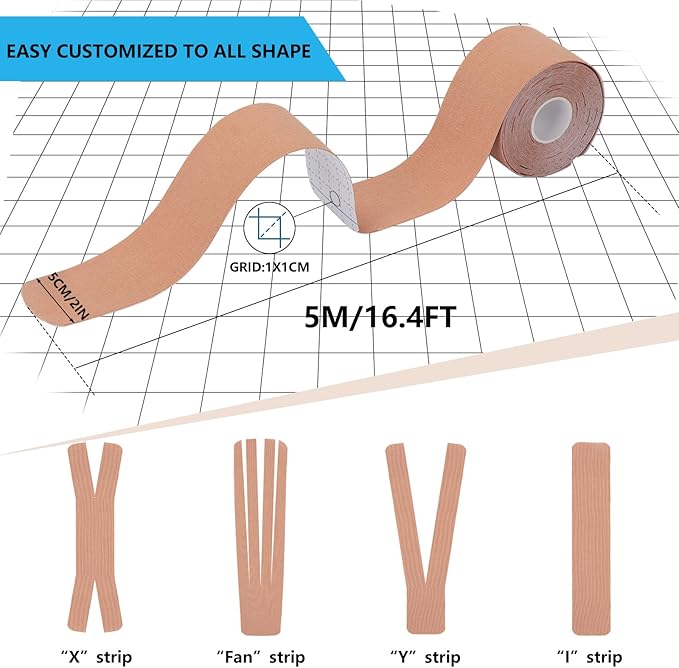 - Easy to Use: Stretch the tape to varying degrees, depending on the strength of support you need. You can also cut the tape to different sizes depending on the lines on the back of the tape. Avoid touching the sticky side with your fingers, as grease can affect its adhesion