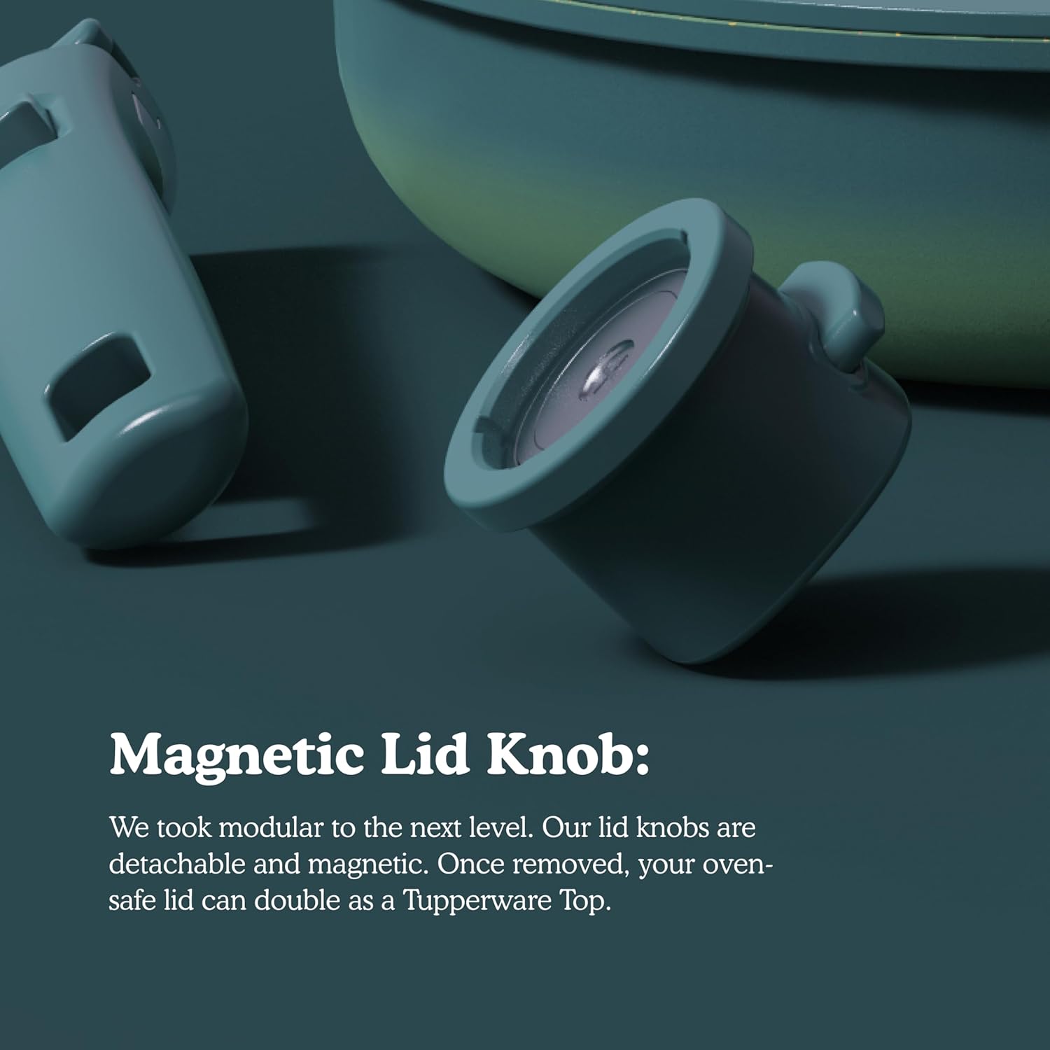 - Magnetic Lid Knob: We took modular to the next level. Our lid knobs are detachable and magnetic. Once removed, your oven-safe lid can double as a container Top.