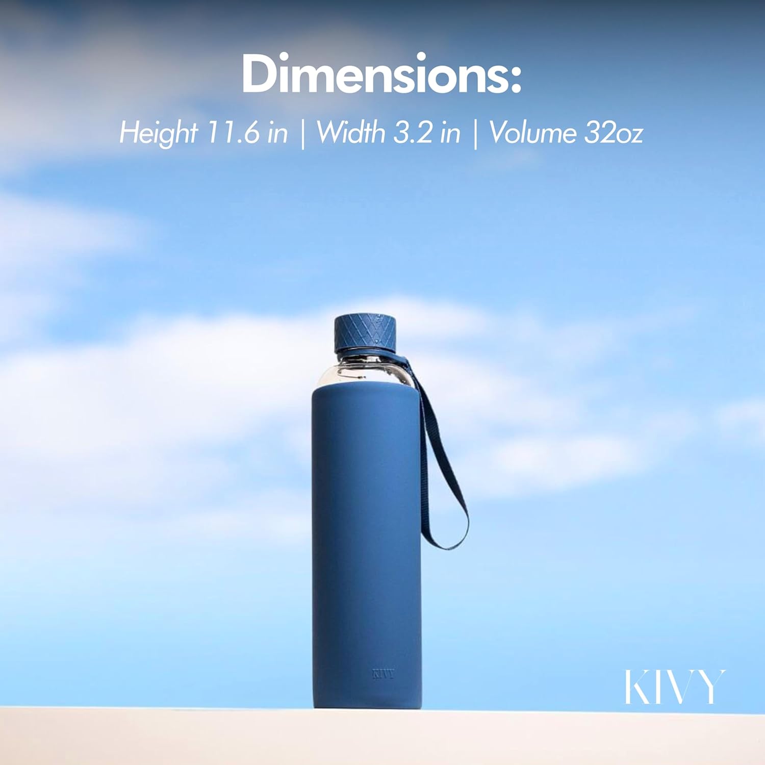 KIVY Glass Water Bottle with Silicone Sleeve 32 oz [WITH MEASUREMENT] - Borosilicate Glass Water Bottle Screw Top - Clear Bottles with Measurement Marking - Slim Waterbottle Aesthetic - Blue