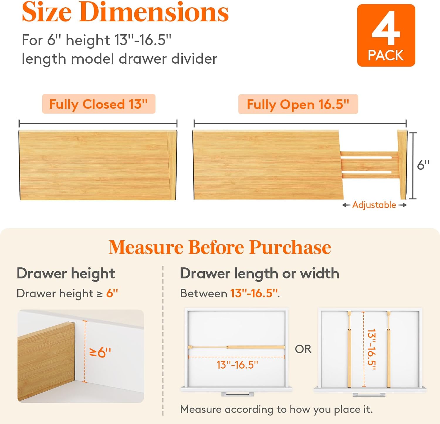 - Expandable Design: These drawer dividers are 6 inches (15.2 cm) high and adjustable in length to fit most drawers with an inner width of 13 to 16.5 inches (33 - 42 cm). Ideal for keeping items organized and drawers tidy. Note: Please carefully Measure your drawer’s inner dimensions before purchasing
