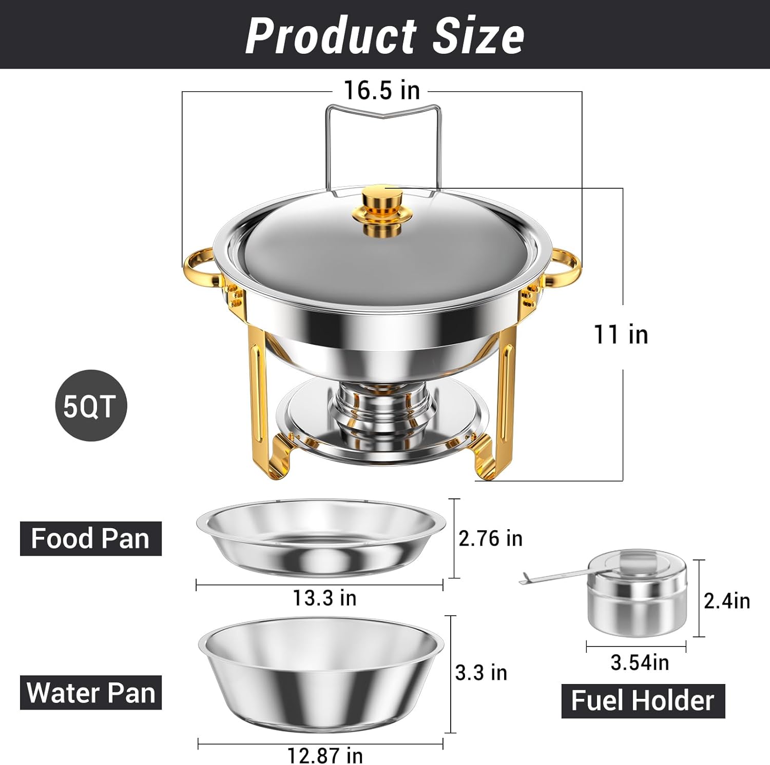 Round Chafing Dishes for Buffet 5 Qt,High Grade Chafing Dish Buffet Set, Full Size Pan,Rolled-Edge Design Food Warmers for Parties,Buffet,Wedding,Birthday,Camping 4 PACK (Half Gold)