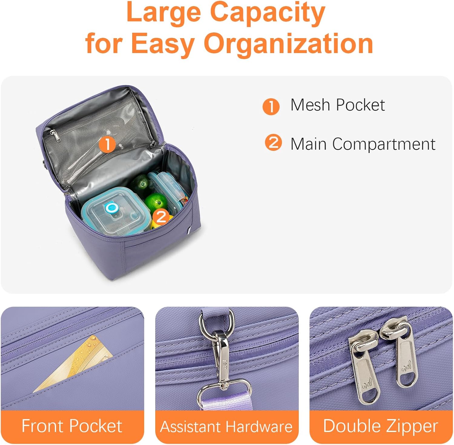 - Construction & Pockets: 1 main compartment with zipper closure(double zips in YKK), 1 interior zip mesh pocket can fit paper napkin, handkerchief, keys, or cellphone. Outside 1 insert pocket in the front of the bag for small essentials.Our lunch bags for women/men is spacious enough to fit your lunch box, snacks, and drinks and prefect to take foods and snacks with your outdoor activities.