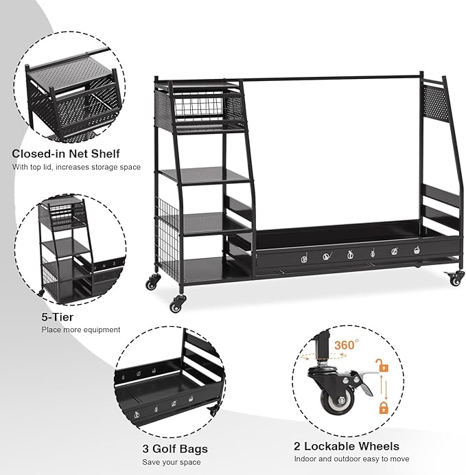 - Large Storage Space: Ideal for golf equipment storage solutions, this golf organizer has 3 main storage parts: the right main single-layer storage part holds 3 golf bags or 2 extra large size golf travel bag; on the top left is 1 closed-in net shelf basket with lid for golf balls and other golf equipment, and the top lid serves as an organizer for towels and other items to increase storage space. Below left are 3 medium-sized shelves for small golf items such as sneakers, hats, or gloves