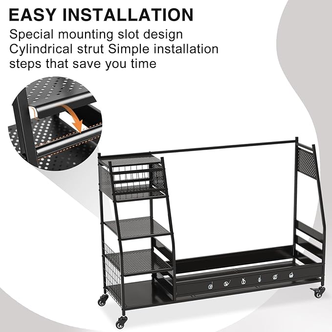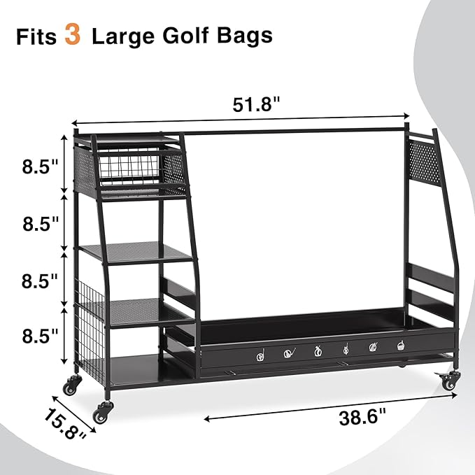 - Easy to Move & Stable When Stationary: The golf club storage stand with storage has 4 wheels that can rotate 360°, and you can push the garage storage stand to wherever you want. 2 of the 4 wheels can be locked, allowing flexible movement while maintaining sufficient stability in the placement position of the golf bag rack holder. The assembled freestanding garage storage station features 51.8'' L x 15.8'' W x 34.3'' H. Please measure where you want to put it before buying