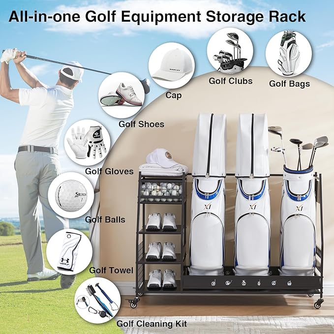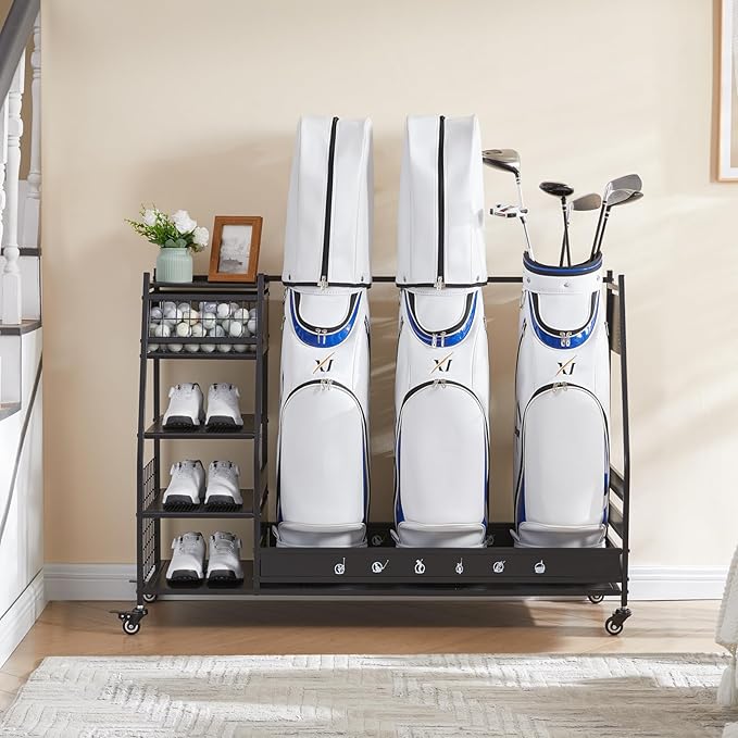 - Multi Occasions: Our golf bag storage can organize almost all your golf accessories, keep your sports and golf equipment in one place, say goodbye to cluttered garages, basements, homes, yoga studios, golf clubs, athletic departments, and storage rooms that are easy to access and space-saving. Valentine's Day is coming up, this superior quality uniquely designed golf ball rack is the ideal Valentine's gift for your boyfriend or husband