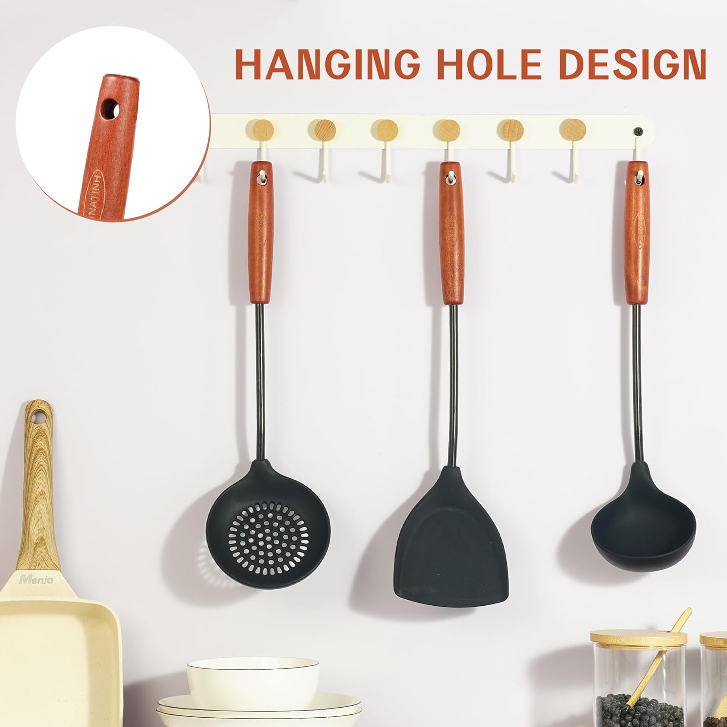 - Unique design cooking utensils : Wooden handle combination of black-plated stainless steel and food-grade silicone,special and durable