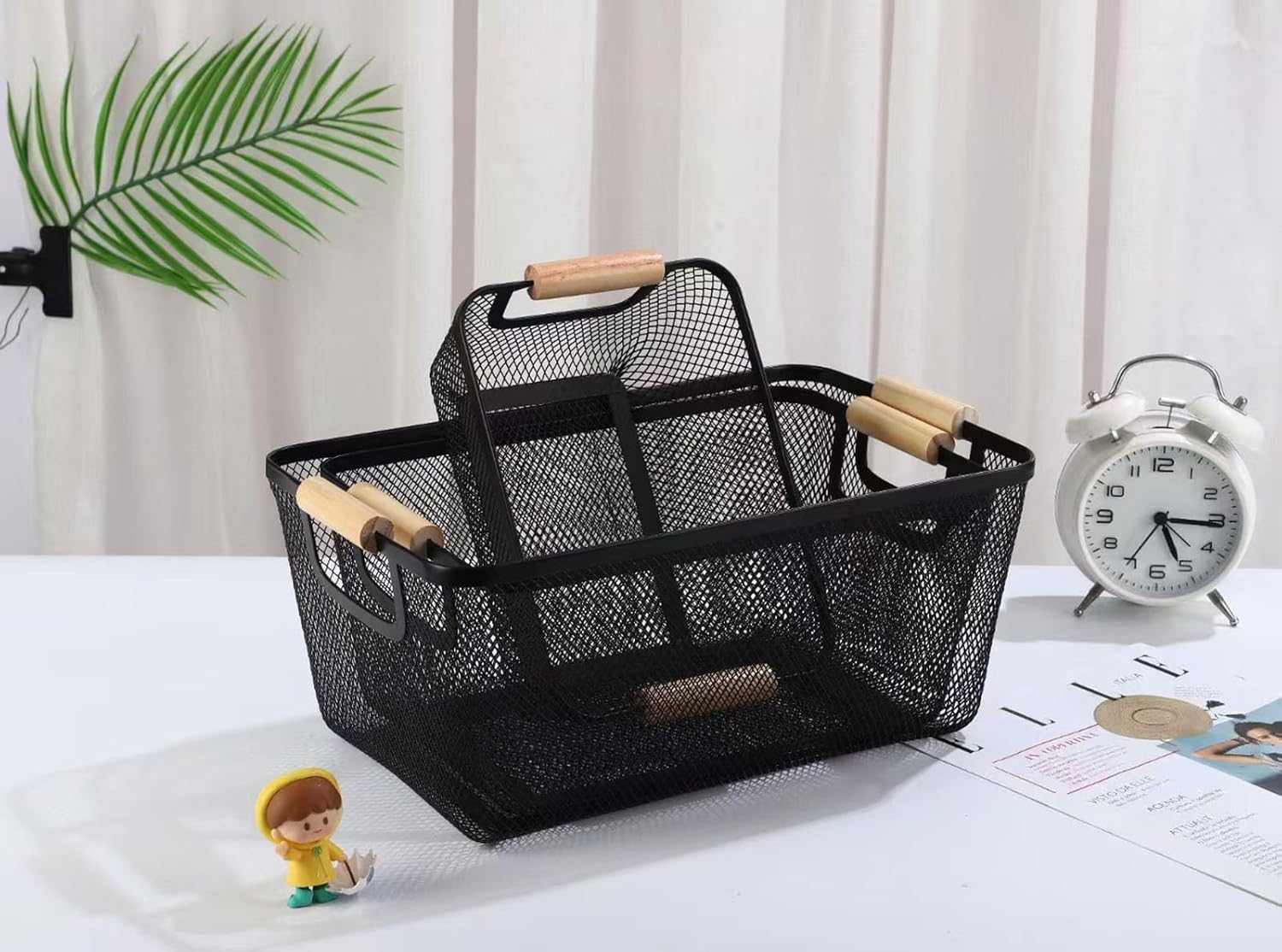 - The metal mesh storage organizer basket bin with wooden handle is a great way to organize or decorate your home, office, apartment, lofts, or other living spaces. This wire basket also can be a fruit basket or garden basket and storing those fruits and vegetables outside the refrigerator. Also as extra storage to meet your needs for household use.