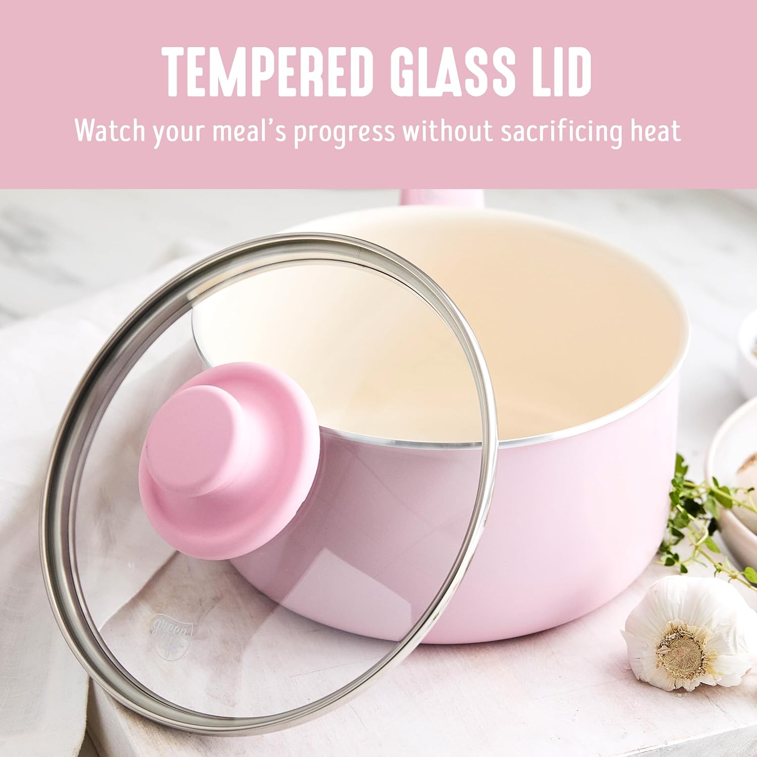 GreenLife 2 Quart Ceramic Nonstick Saucepan with Lid, PFAS-Free, Stay-Cool Handle, Multipurpose Kitchen Cooking Pot, Dishwasher & Oven Safe, Pink