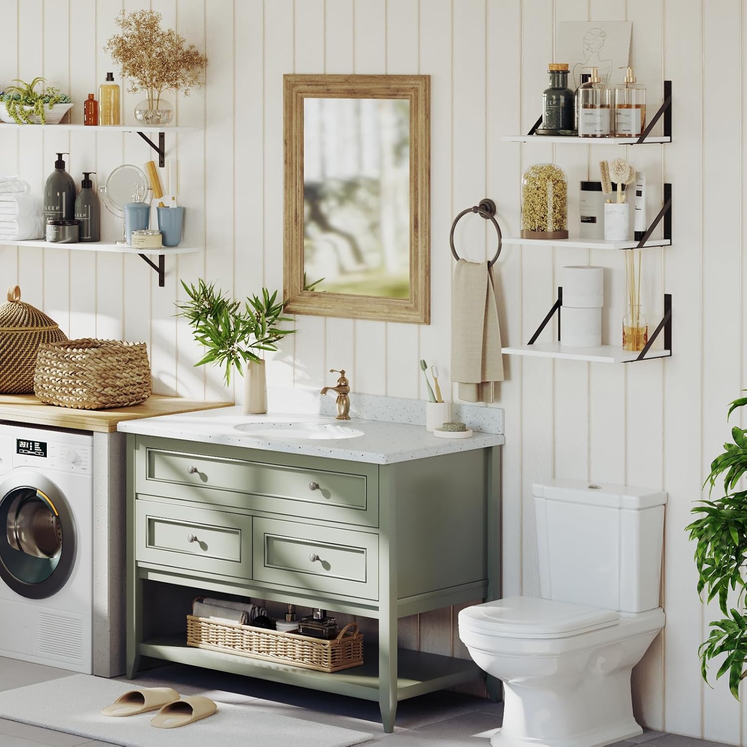 - 【Versatile in Any Room】Metal brackets can be installed on the top or bottom of the shelf. Use it as a bookshelf in the study, a floating nightstand in the bedroom, a display shelf for family photos and legos in the living room, a bathroom shelves for toiletries. Upgrade your kitchen and laundry with these ledges