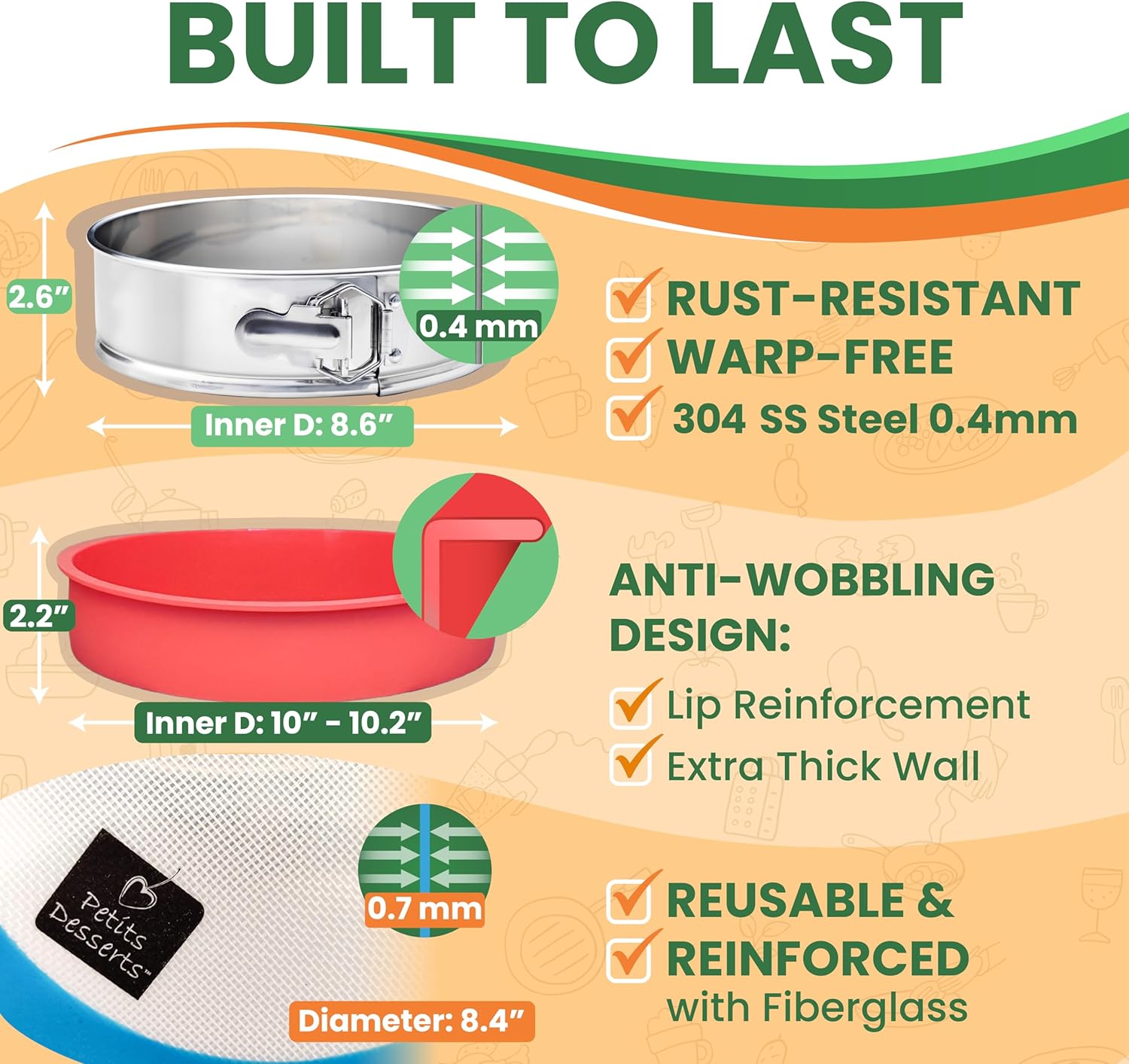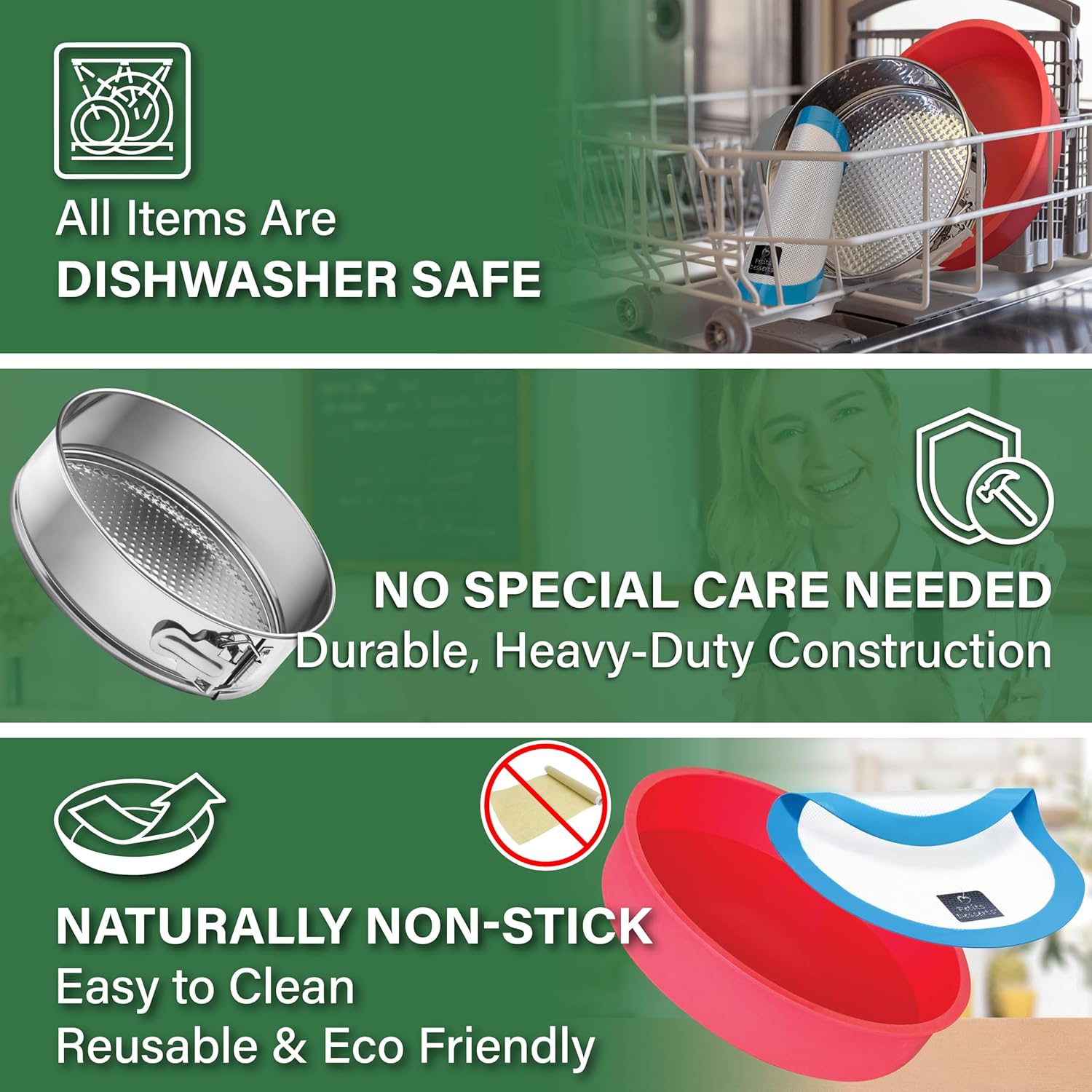 - EFFORTLESS CLEANUP & LOW MAINTENANCE – Save time with our DISHWASHER-SAFE springform pan stainless steel and two silicone items designed for hassle-free maintenance. The stainless steel resists stains and odors, while the non-stick silicone material ensures quick and easy post-baking cleanup.