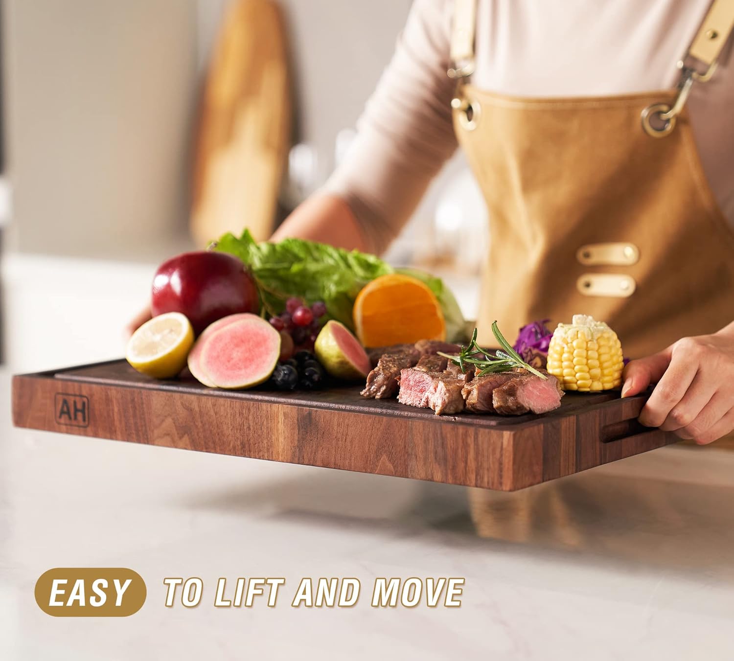 - FUNCTIONAL & VERSATILE – This reversible butcher block measure 17x13x1.5 inch, 8.37 lb, large enough to cut everything from meet, fruits to veggies, the weight keeps it from shifting, which is safer with big cutting jobs. Deep juice groove on one side to efficiently catch any liquid during food prep and serving. Super easy to lift and move with built-in handles on both ends. It can also double up as a cheese platter, charcuterie board, or serving tray