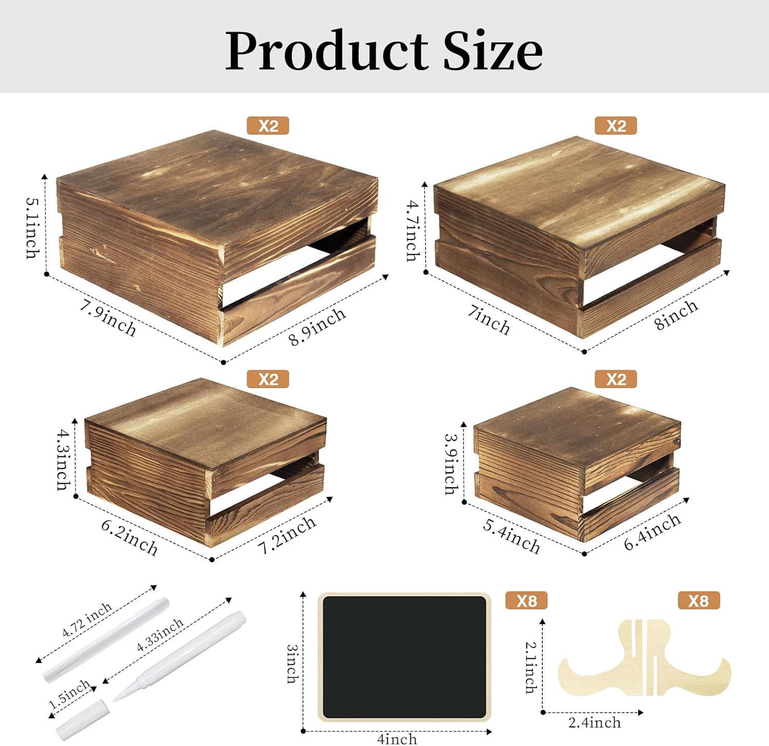 - Your Party's Sweet Companion: You will receive a set of 8 wooden cake stand risers (available in 4 sizes), 8 wooden signs and 2 pens, enough quantity and different sizes to meet the needs of different sizes of cakes, snacks and desserts for display. The wooden signs can be used to write down hints for ease of use while adding elegance to your dessert table.These wooden stackable display boxes will not take much displaying space