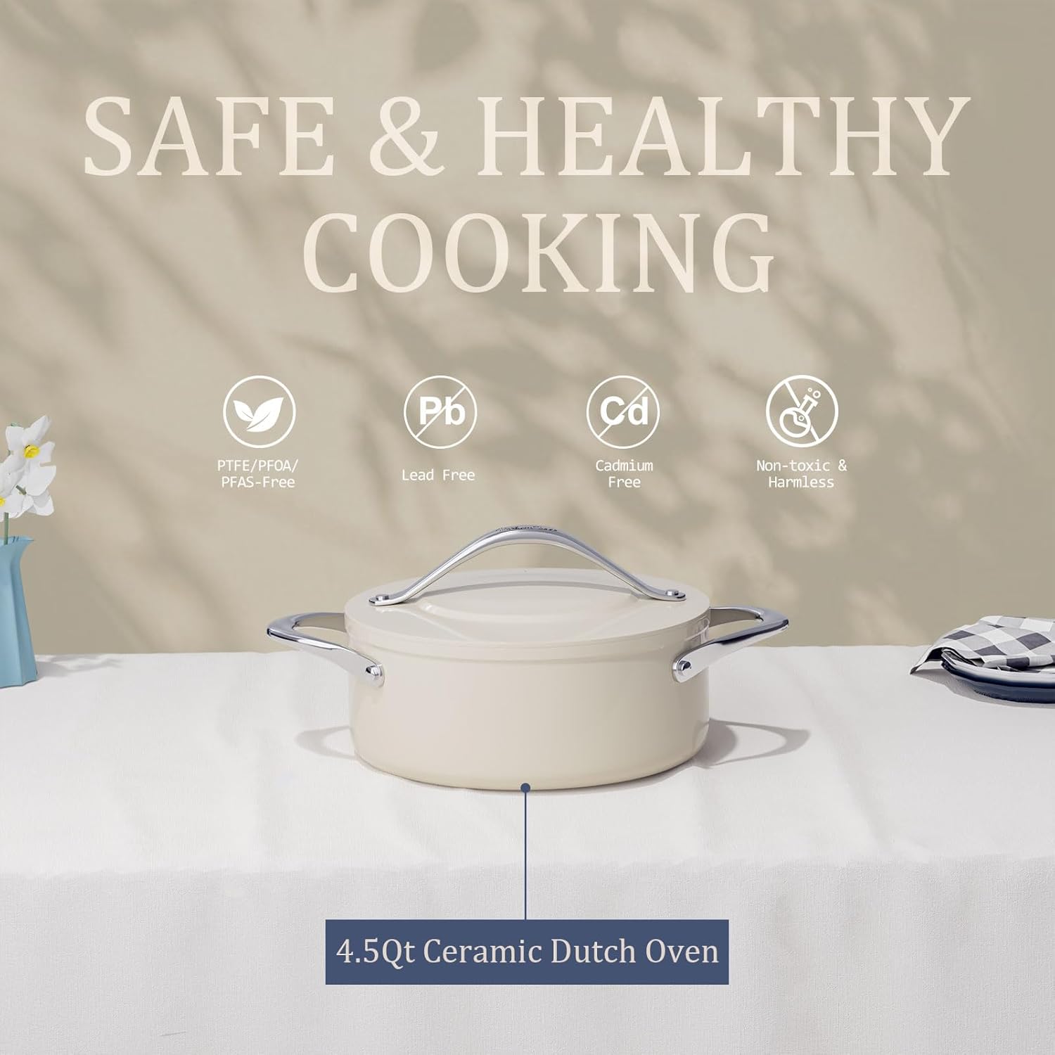 Stock Pot 4.5qt Dutch Oven with Lid (9.5") Nonstick Ceramic Coated Non-Toxic PFAS-Free Even Heat Distribution for Braising, Baking Bread & Soups, Compatible for All Cooktops(Induction/Gas/Electric) Oven Safe to 500ยฐF (Cream)