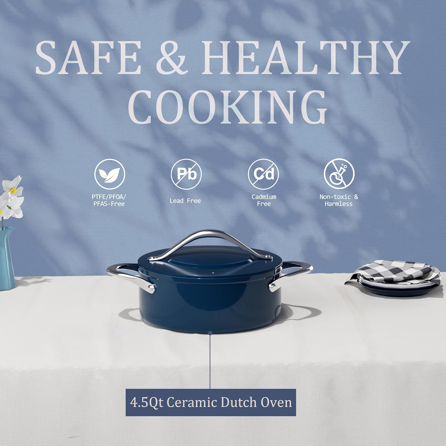 Stock Pot 4.5qt Dutch Oven with Lid (9.5") Nonstick Ceramic Coated Non-Toxic PFAS-Free Even Heat Distribution for Braising, Baking Bread & Soups, Compatible for All Cooktops(Induction/Gas/Electric) Oven Safe to 500ยฐF (Navy Blue)