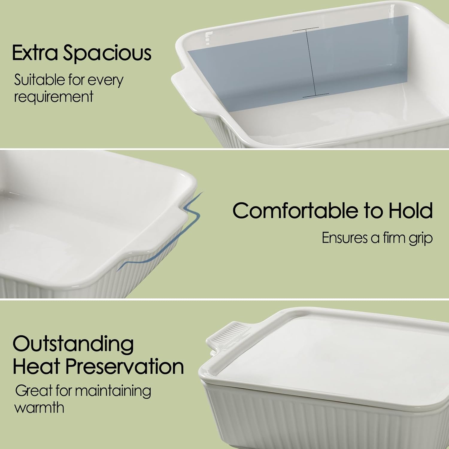 - EASY TO HANDLE: Designed with two convenient handles, this lasagna baking dish allows for easy transfer. Whether moving ceramic lasagna pan with handles from the kitchen to the dining table, simply grip the handles to carry the pot with confidence and comfort.