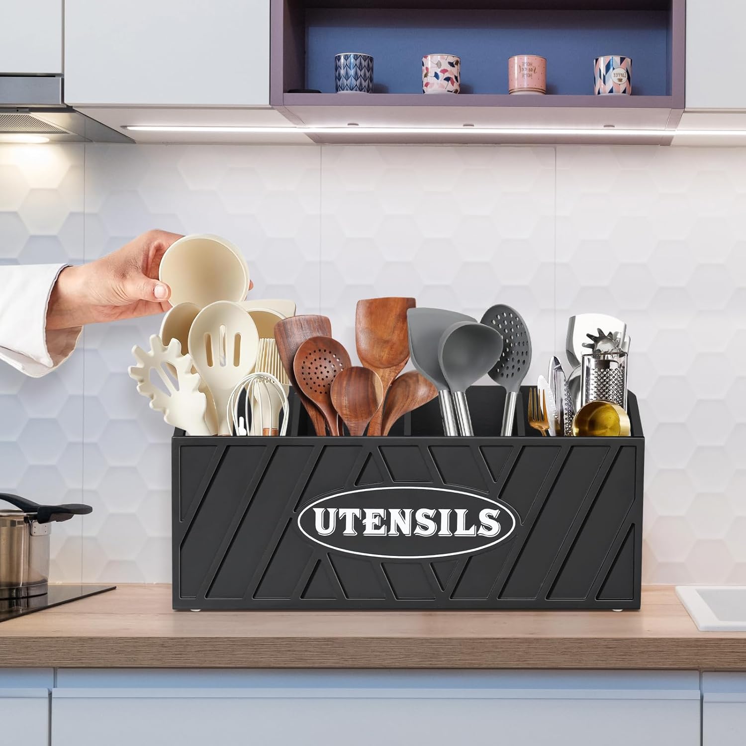 - 【Large Utensil Holder with Handles】Our kitchen utensil holder has 4 compartments, which is spacious enough to hold utensils. The dividers of utensil organizer for kitchen counter is movable, which can sort your spatula, spoon, knives, tongs and other cooking tools orderly. Keep your utensils at fingertips instead of digging through a drawer. Handles on both sides allow you to move utensil caddy easily. This cooking utensil holder is a must-have for anyone who appreciates a well-organized kitchen