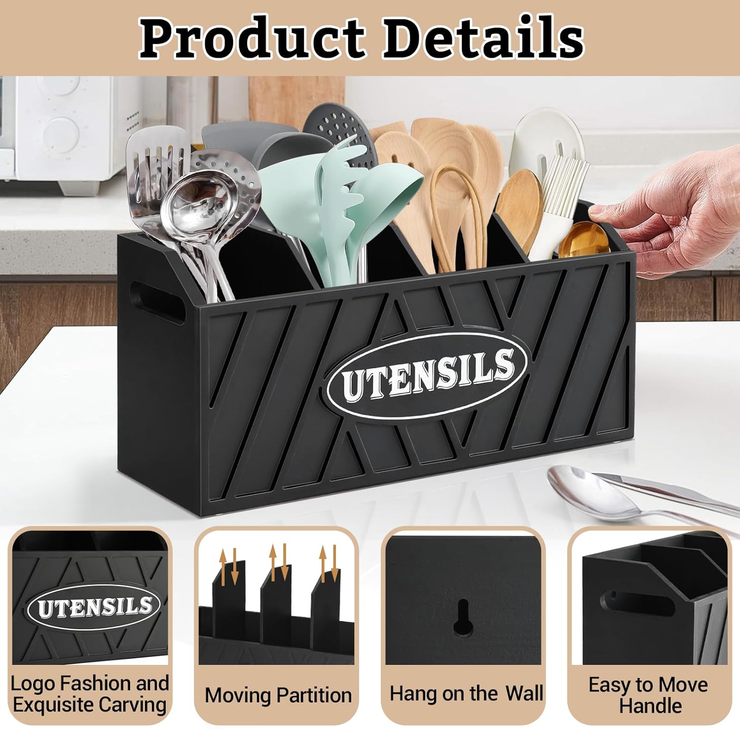 Large Wooden Utensil Holder, Black, 4 Compartments, Countertop or Wall Mount, Kitchen Gadget Organizer
