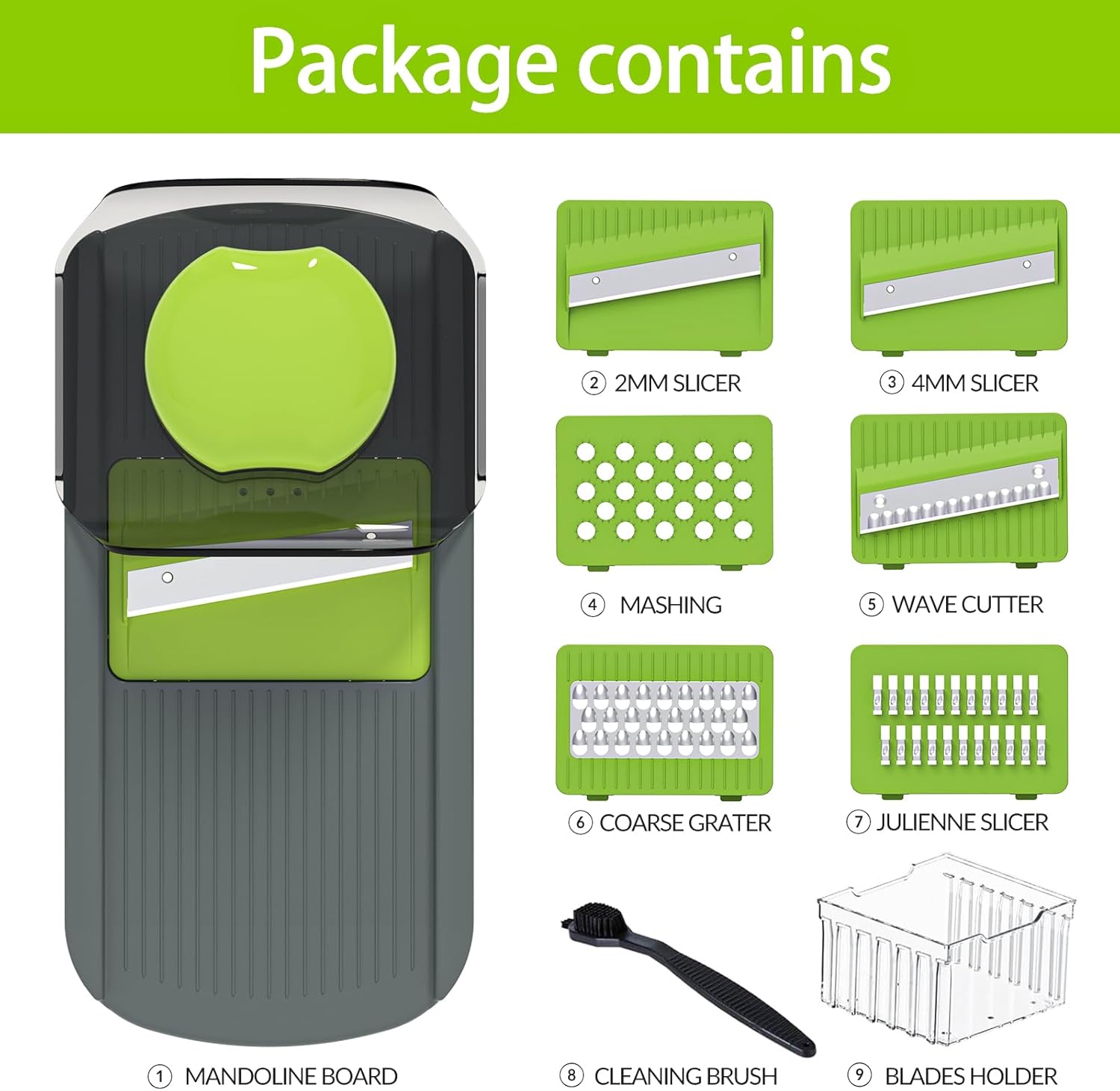 - Smart Designed : Safety lock design can better protect your fingers. knife holder boxes can storage blades, saving more kitchen space. Non-slip bottom ring keep the whole food slicer sturdy while maintaining better stability