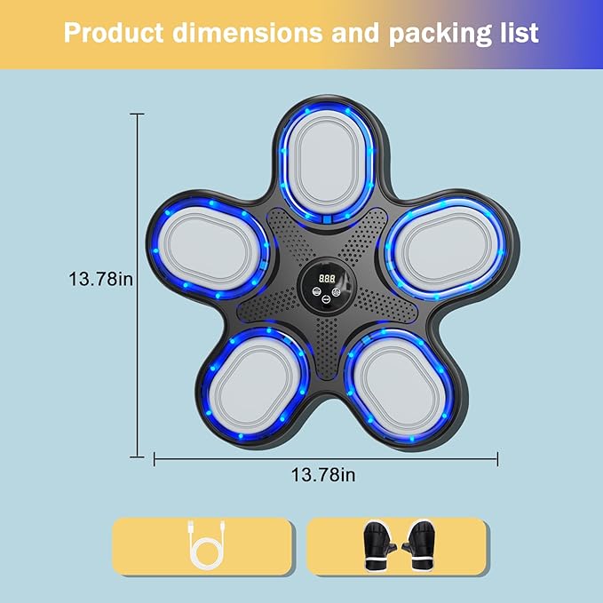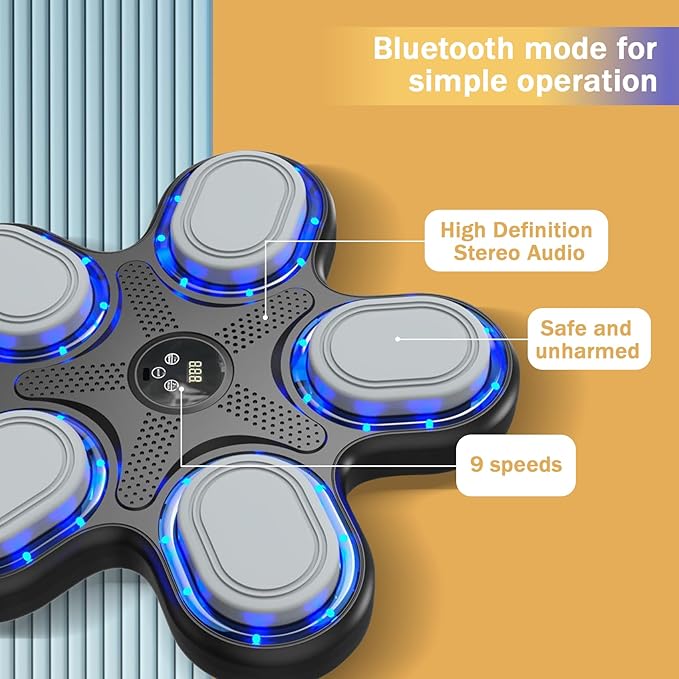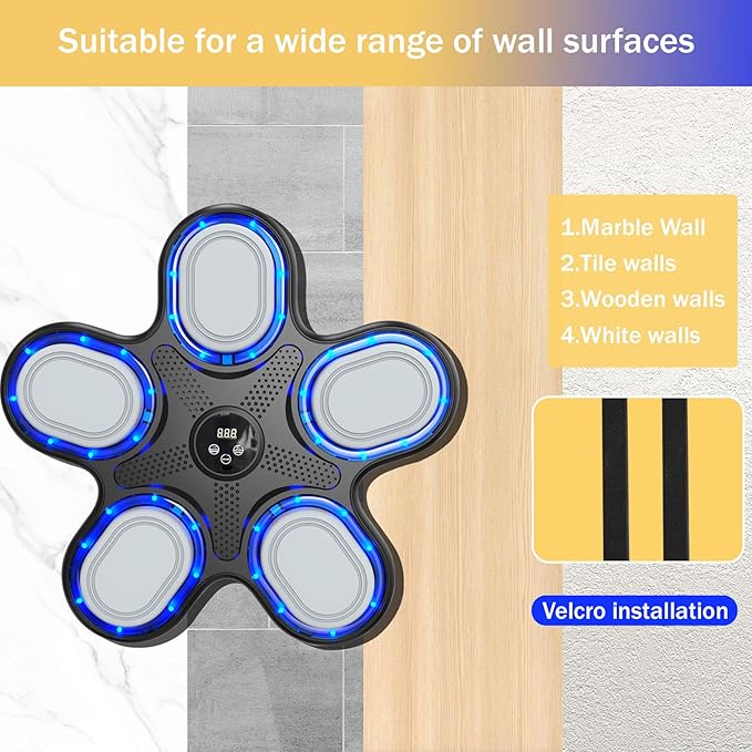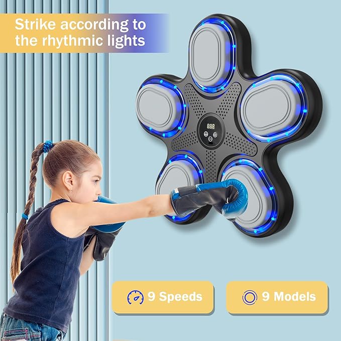 - High Quality And Durable:The music boxing machine wall is made of high quality material, used with the included boxing gloves, it can withstand high-intensity exercise and won't hurt your hands.Nine gears speed regulation, one key on/off switch, HAU mode adjustment, cool lights.