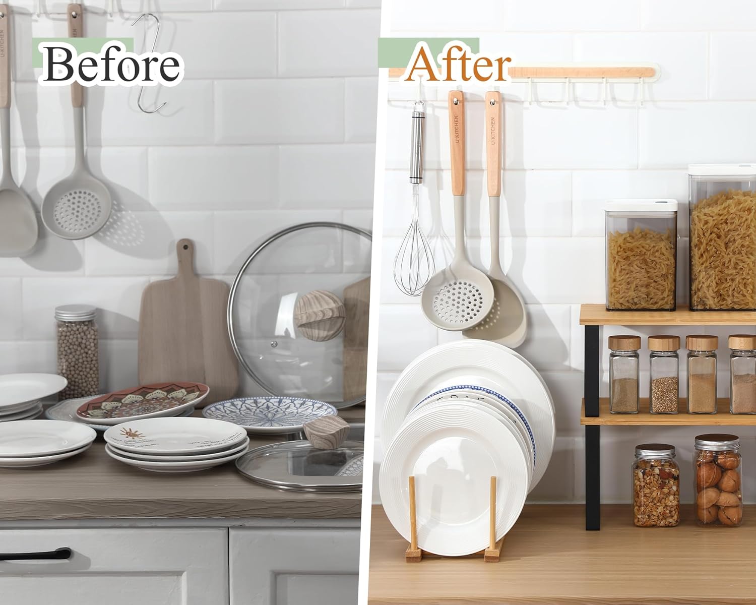 - Save Space: this kitchen organizer set is not only suitable for kitchen storage, spice jars, containers, cans, pot lids, pans, cutting boards but also can be used as a storage tool for cups, books, photo frames, painting books, cosmetics, toiletries, cleaning tools and other messy things; Help you save space and reduce storage troubles to make your life clean and tidy