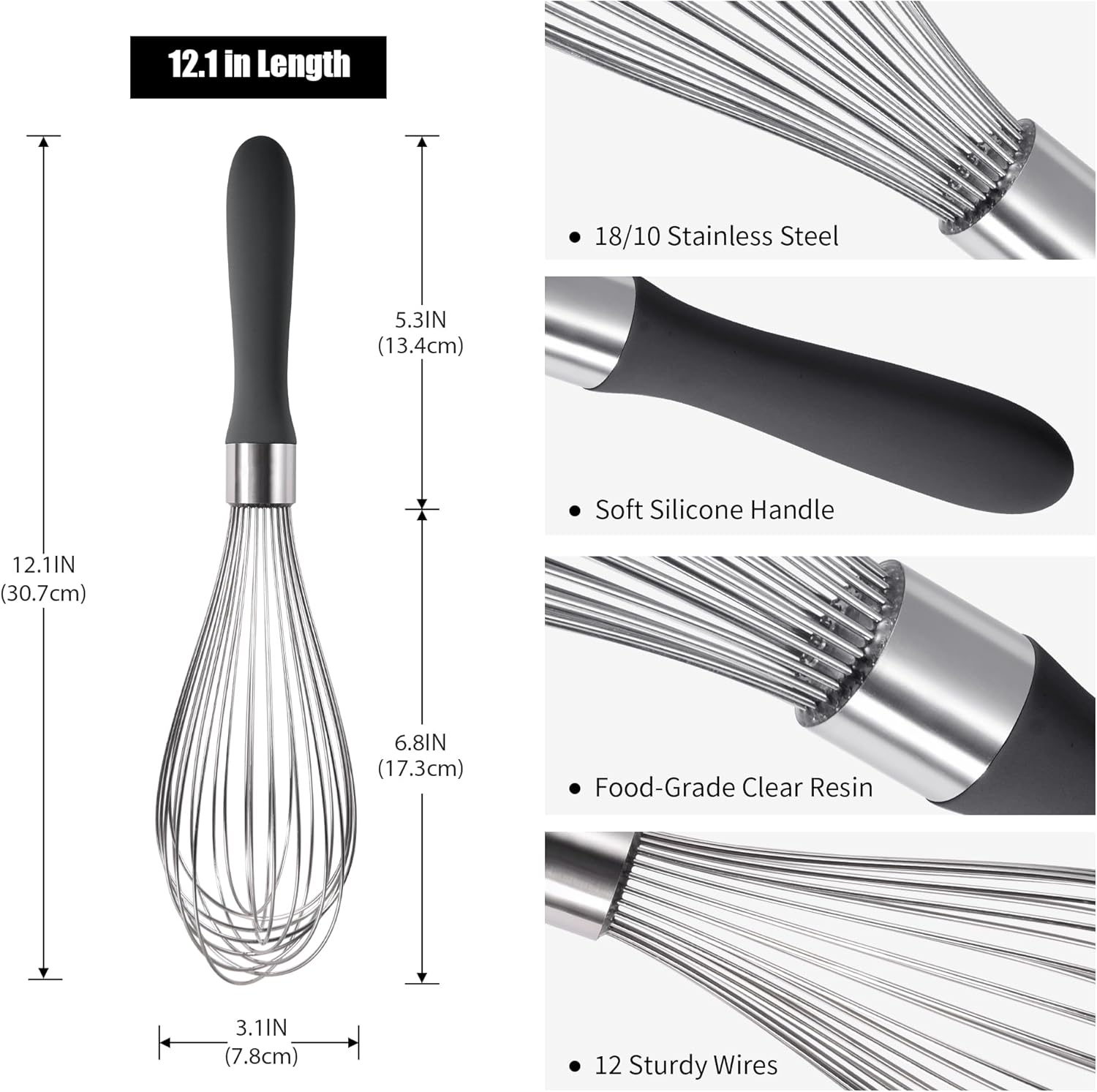 18/8 Stainless Steel Balloon Whisk, Doosu Kitchen Whisk for Cooking Handheld Egg Beater with Rust-Proof Sturdy Wires & Non-Slip Silicone Handle for Beating, Stirring, Blending (12 Wires, Black)