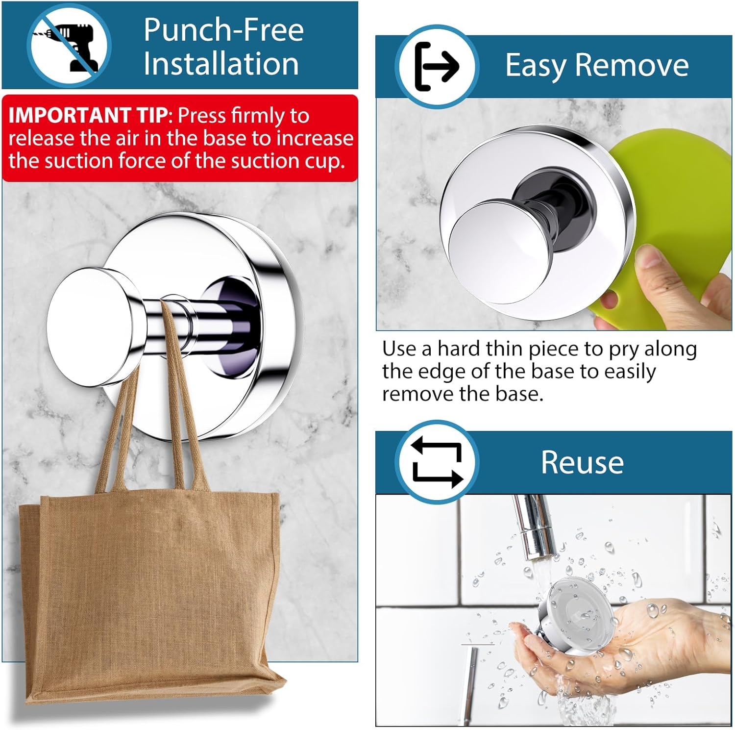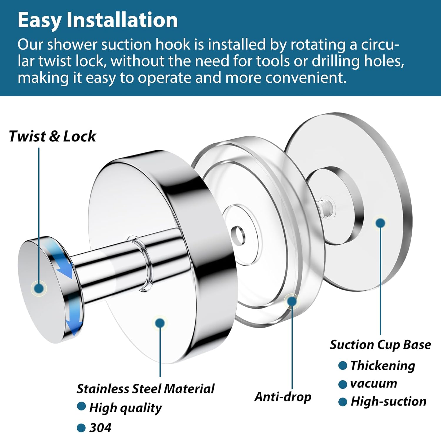 - 【No Screws Required & Reusable】 The stylish shower suction cup hook is made of waterproof and rust-proof 304 stainless steel material, and the excellent vacuum suction technology allows you to easily install and remove without tools or screws. Pry it out with a knife, clean the bottom of the command hooks and dry it for reuse.