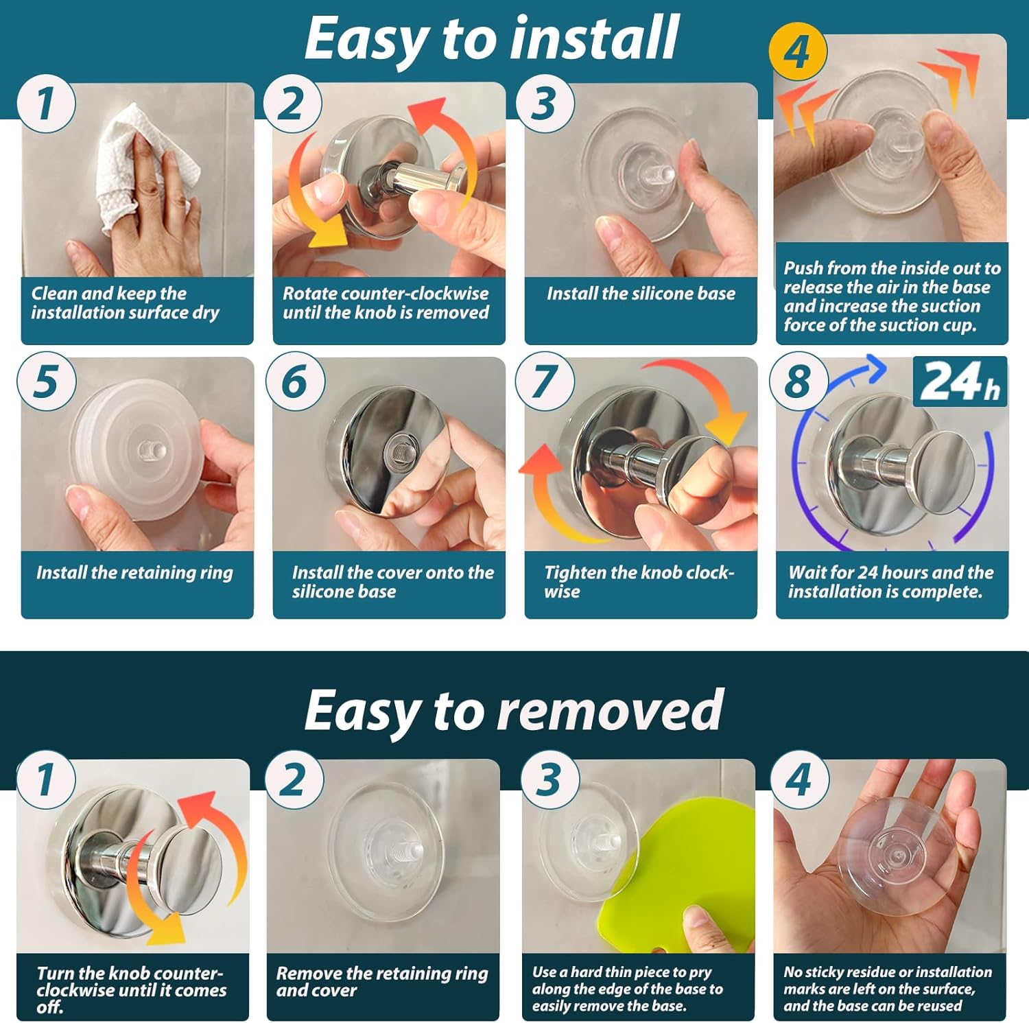 - 【Easy to Install and Use】 AbluFirst shower hooks do not damage walls during use. Just choose a smooth surface, twist and lock, and it’s done quickly. (Please refer to the instructions for detailed steps) The high-quality suction cup adhesive can be easily removed or repositioned without leaving sticky residue or installation marks.