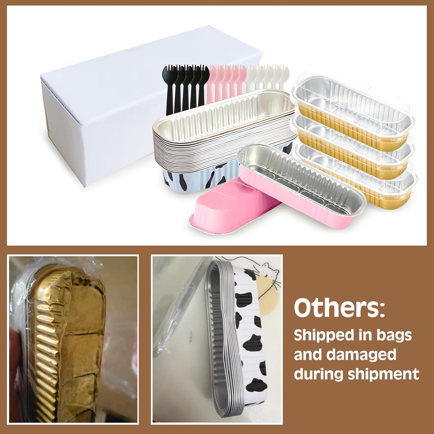 50 PCS Multiple colors Mini Loaf Pans with Lids and Spoons, 6.8oz Mini Cake Pans for Baking, Disposable Aluminum Foil Loaf Pans, Loaf Baking Pans for Party Individual Serving.