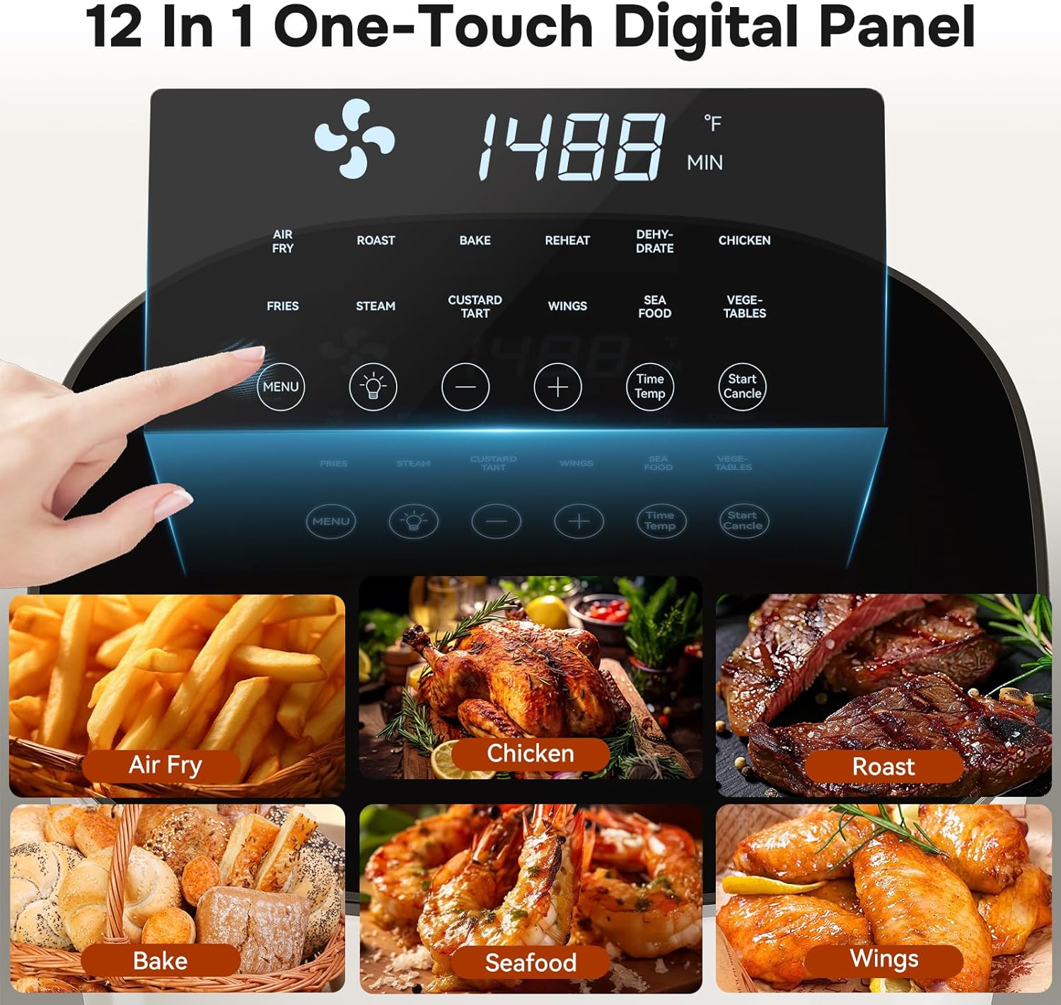 - Fast Cooking & Simplified Set-Up : With advanced rapid air circulation technology and 12-in-1 preset modes, makes you prepare meals quickly and easily. From crispy fries and juicy wings to roasted veggies and desserts, it’s your all-in-one kitchen solution for busy days