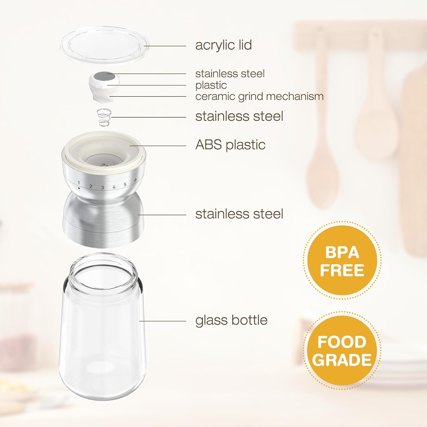 - 6 Adjustable Grinding Settings - Vucchini salt grinder features 6 adjustable grinding settings, allowing you to easily customize the coarseness from fine powder to coarse grains, providing clear visibility and quick access to your preferred grinding level.