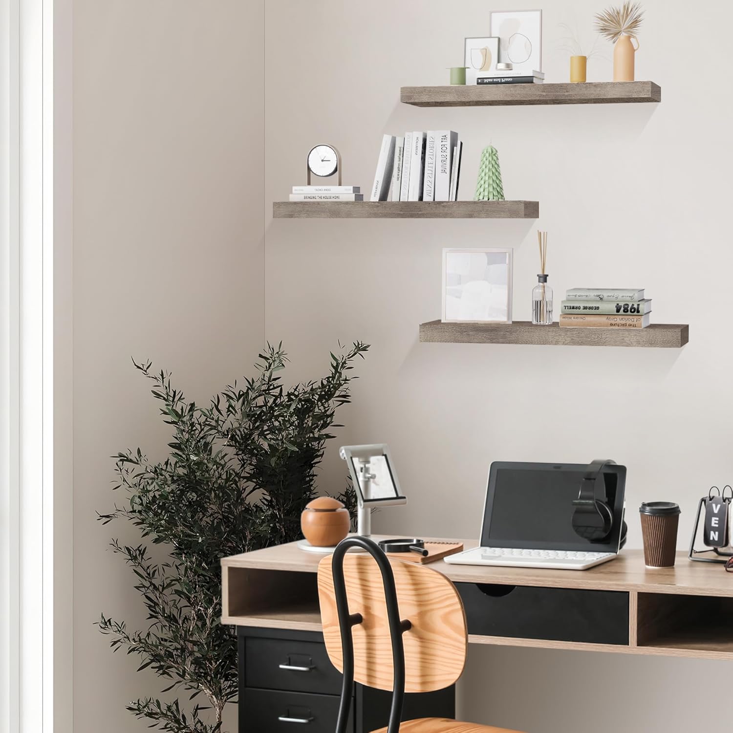 - VERSATILE AND STYLISH DESIGN: Elevate your space with our wall shelves, available in wood, black, white, and gray. These floating shelves come in two sizes (24 inches and 36 inches) and feature a natural wood texture that blends seamlessly with any decor style.
