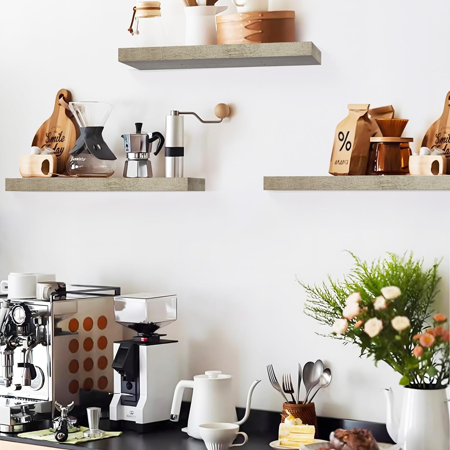- STRONG AND DURABLE: Crafted from high-quality materials, these kitchen wall shelves are 1.5 inches thick and 9.25 inches wide, capable of holding up to 50 pounds. Solid brackets ensure no sagging or wobbling, providing reliable support for your favorite items.