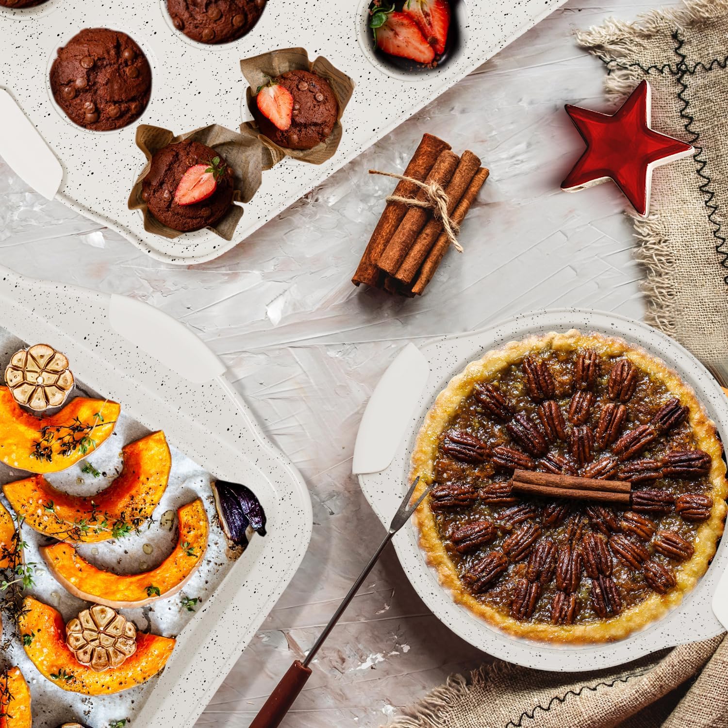 - Versatile 10-Piece Baking Pans Set: This comprehensive baking pan set includes 2 cookie sheets, 1 roasting pan, 2 muffin pans, 2 pie pans, 1 square pan, 1 pizza pan, and 1 loaf pans. Covering all your essential baking needs, this set is perfect for your home kitchen