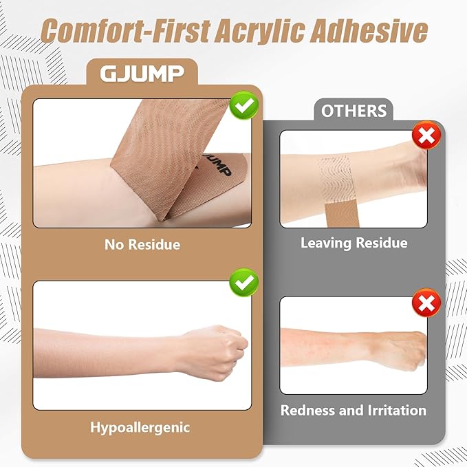 - Relieve Fatigue & Accelerate Recovery: GJUMP kinesiology tape crafted with innovative materials and a precision-fit design, adheres seamlessly to the skin, enhances blood flow, effectively alleviates exercise-induced muscle fatigue and tension, and helps reduce swelling.