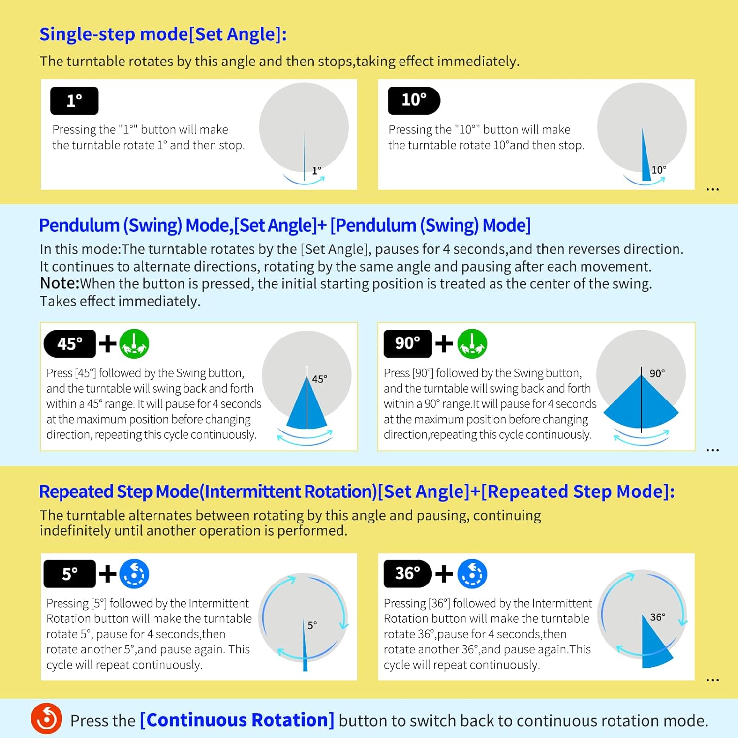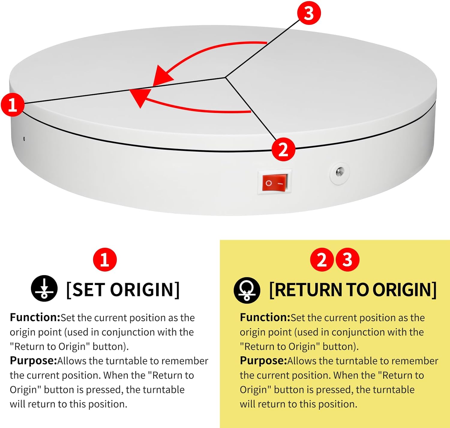 - 【This spinning display stand includes a Professional Flagship Remote Controller】:Precise angle settings and user-friendly combination key design enable support for a wider range of applications. Support: Set the current position as the origin point (used in conjunction with the "Return to Origin" button). Support: Save the current settings to the turntable's internal flash. More versatile angle buttons and mode button combinations provide greater flexibility for various applications