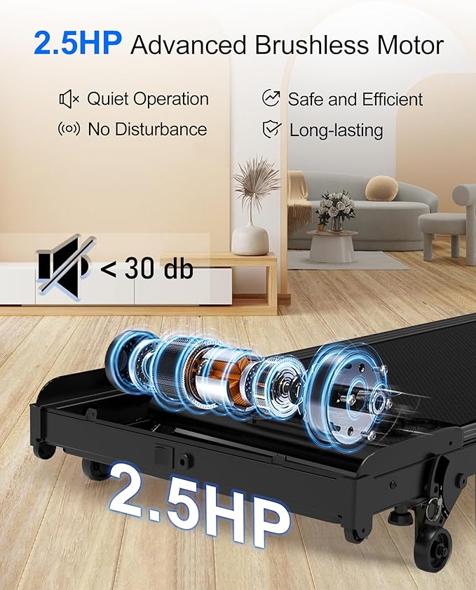 - Powerful Brushless Motor: This walking pad treadmill features a quiet 2.5HP brushless motor, running up to 8 hours without overheating. It is perfect for home or office use, especially for those seeking a portable treadmill, mini treadmill, or walking pad under desk