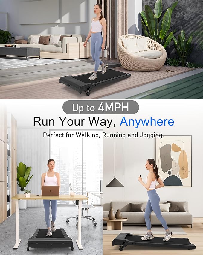 - 2-in-1 Walking Pad Treadmill: This versatile walking pad treadmill speed range of 0-4 mph, adjustable to suit your needs. Perfect for home aerobic jogging or as an under desk treadmill, allowing you to balance work and exercise. It supports a max weight of 265 lbs