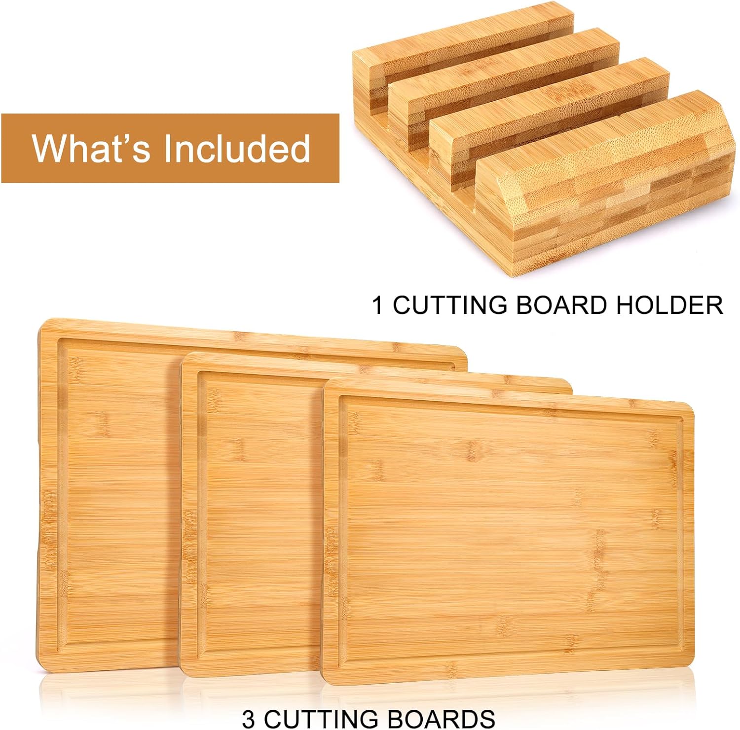 - Measurements: Cutting board set includes 3 chopping boards of various sizes: "XL" size is 17" x 12", suitable for meat or steak "L" size is: 15" x 11", suitable for vegetables, "M" size is 13" x 10", suitable for fruit. Can meet your are great for most kitchen uses. This set not only provides three versatile wood boards but also a stylish holder to keep them organized and accessible.