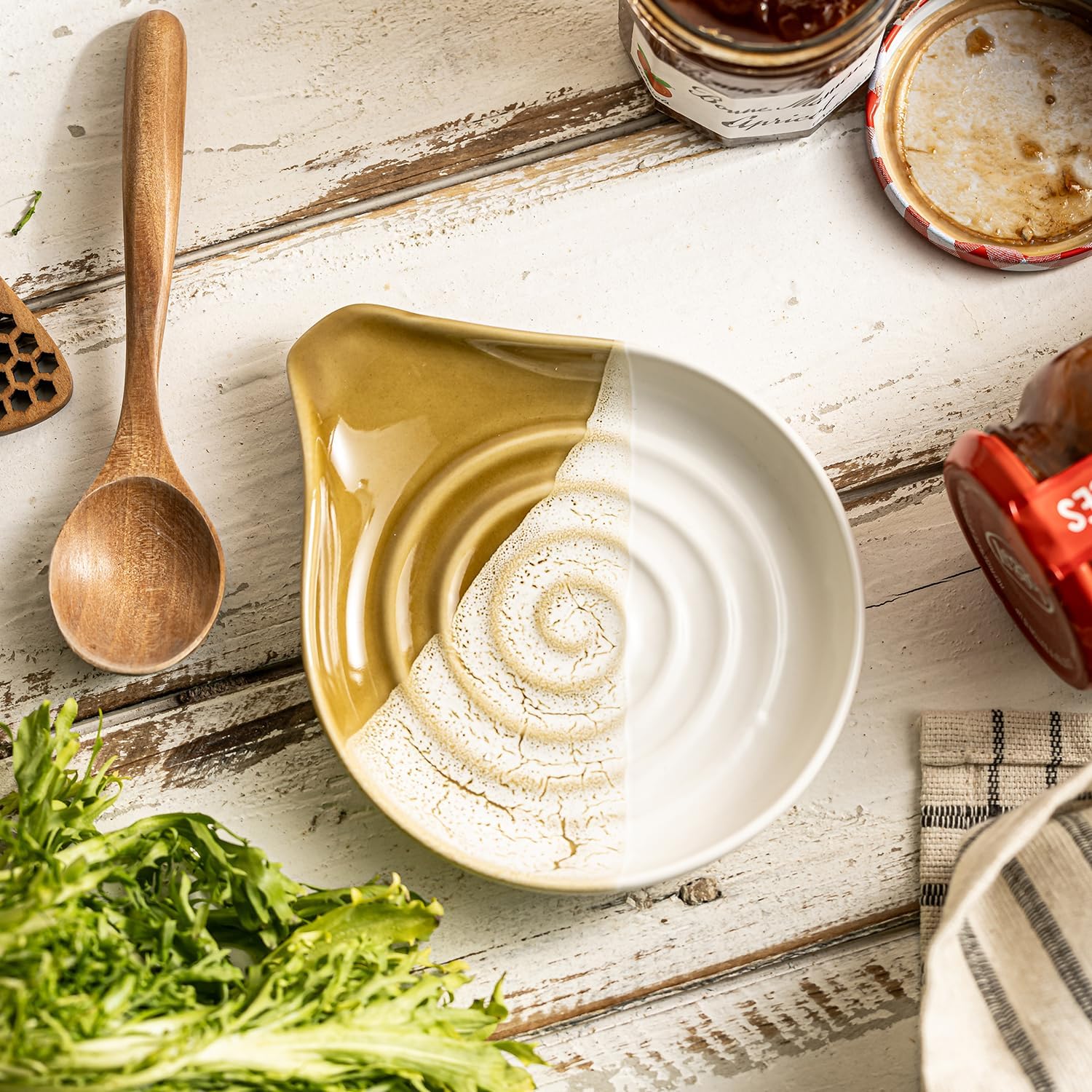 - Elegant Ceramic Design: Crafted with a sleek glaze and swirl pattern, this cute ceramic spoon rest not only serves as a practical spoon holder but also adds a touch of style to your kitchen decor.