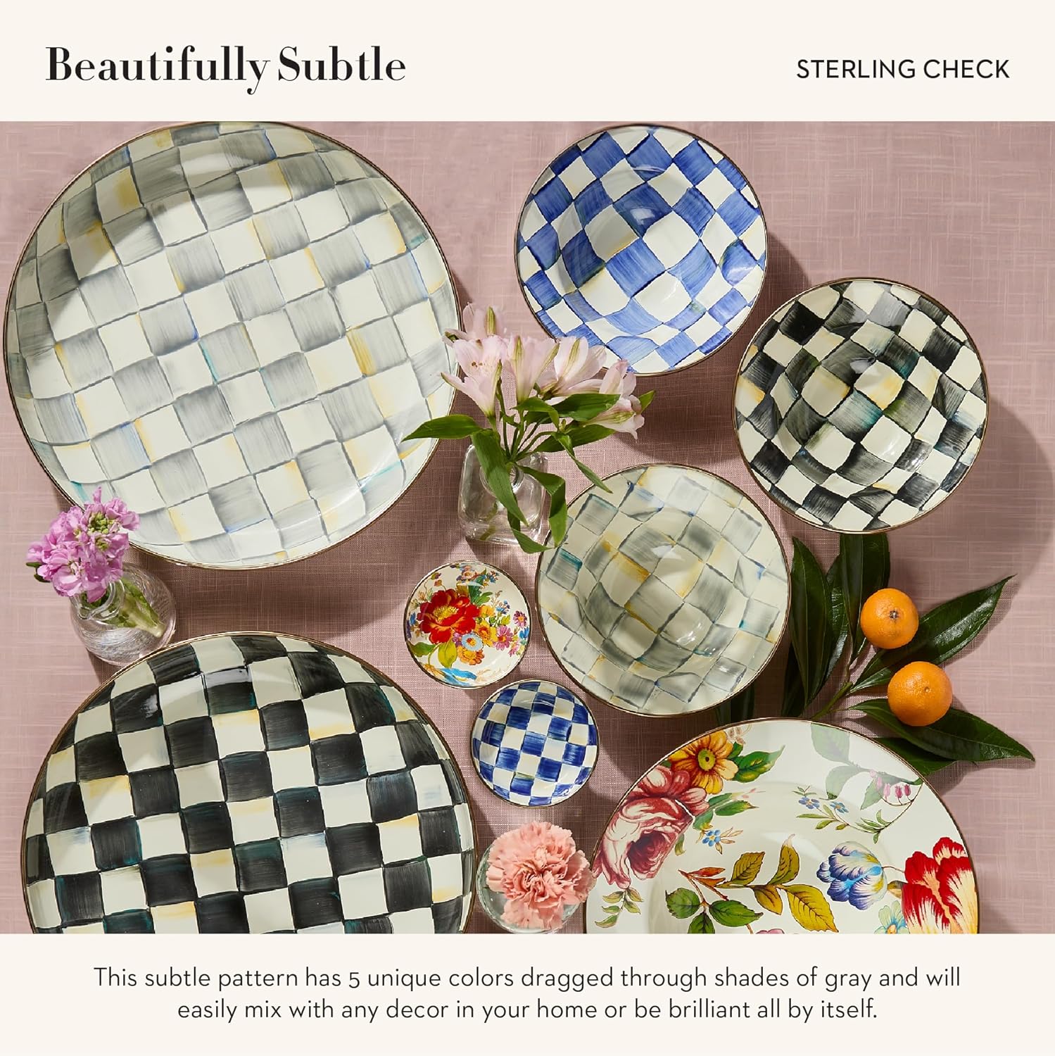 MACKENZIE-CHILDS Enamel Salad Serving Set, Enamel Bowl and Wooden Salad Servers, Decorative Kitchen Set, Gray-and-White Sterling Check