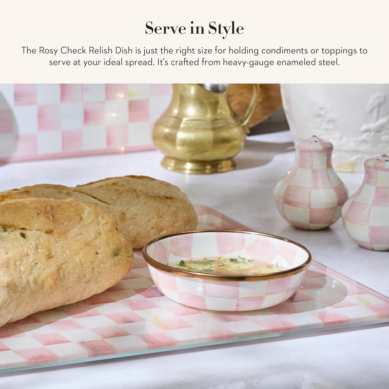 MACKENZIE-CHILDS Enamel Relish Dish, Small Serving Bowl for Entertaining, Pink-and-White Rosy Check