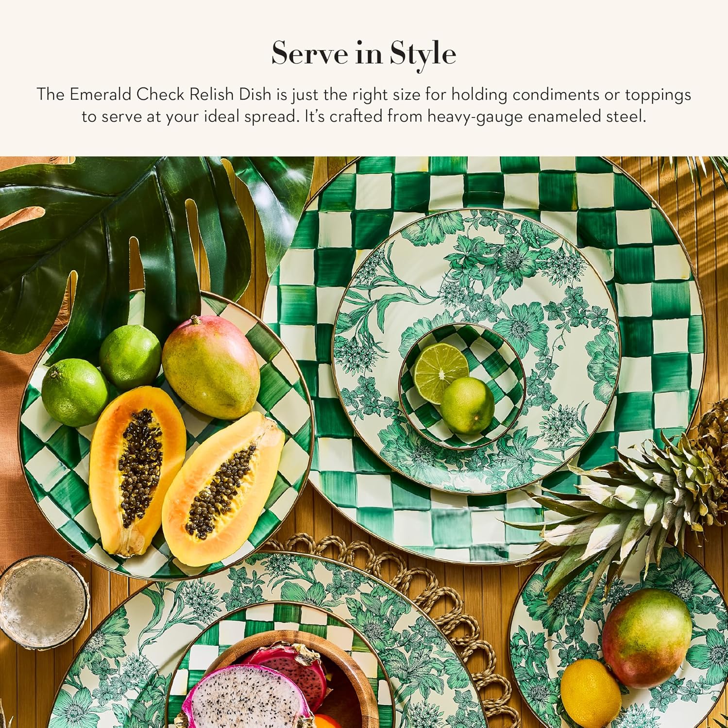 MACKENZIE-CHILDS Enamel Relish Dish, Small Serving Bowl for Entertaining, Green-and-White Emerald Check