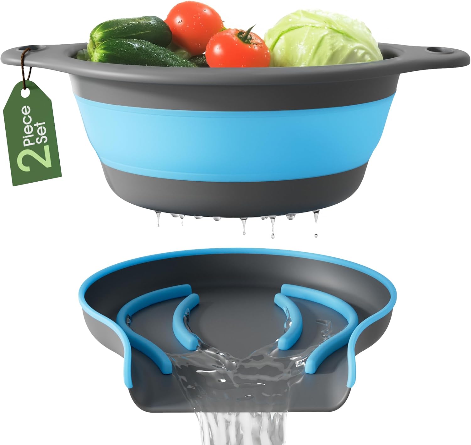 Strainer with Self-Draining Base (5QT) Over-Sink Collapsible Kitchen Colander Set with Side-drain Base for Pasta Vegetables and Fruit, XL Large Capacity, Dishwasher Safe (5-Quart) Blue/Gray