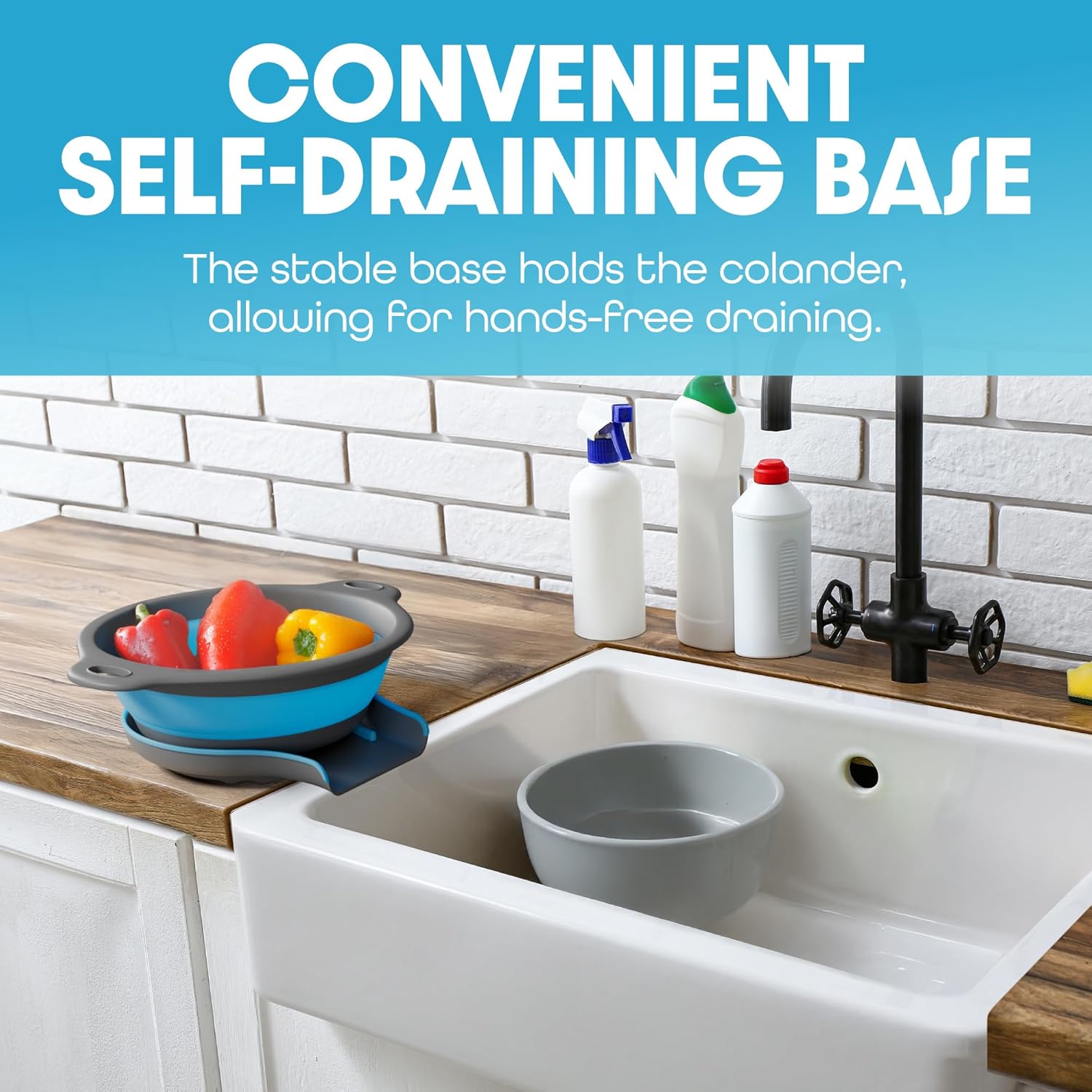 - This collapsible colander features an innovative self-draining base that allows water to drain directly into your sink, even when it's full.