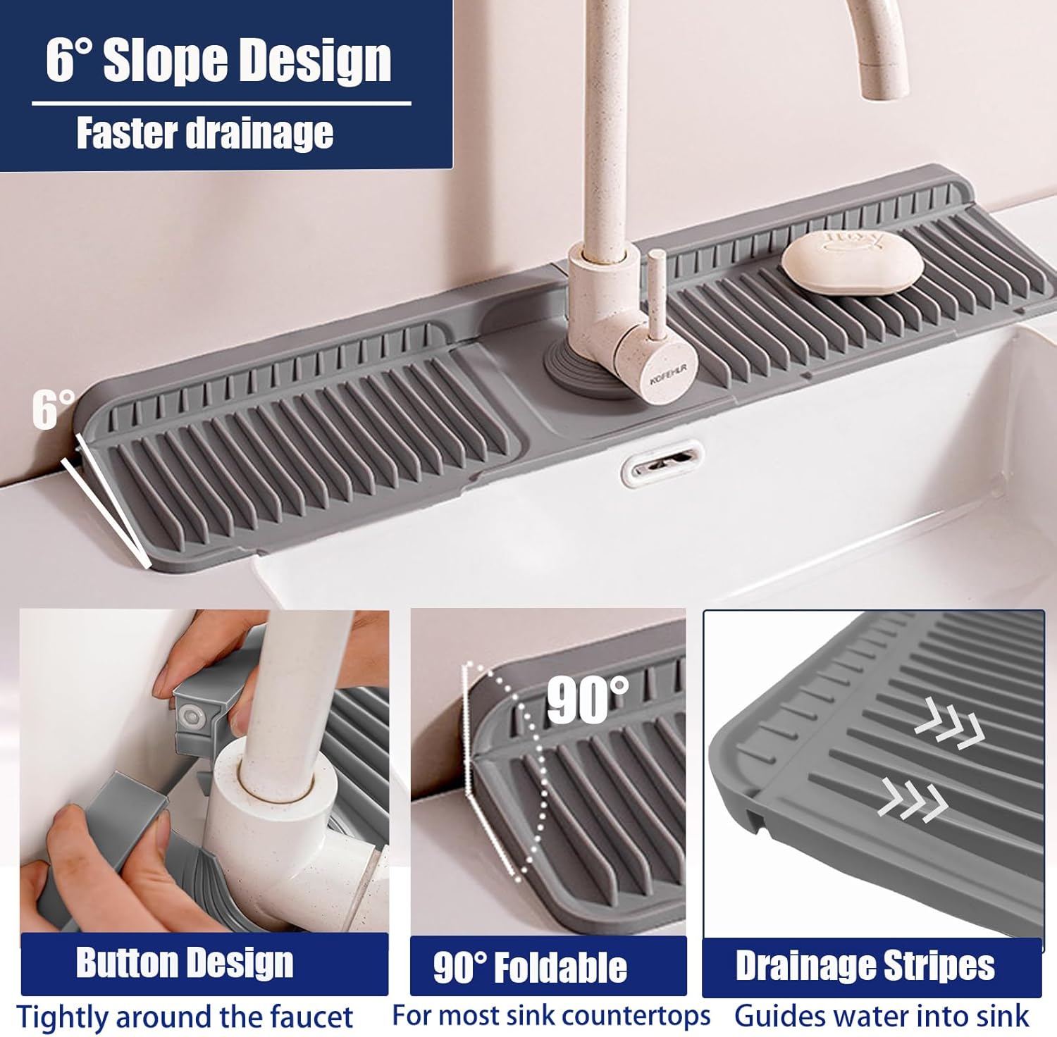 - 6° Slope Design & Button Fixation:Featuring a 6° slope and drain stripe design,the kitchen sink mat efficiently guides water back into the sink,preventing water buildup that causes mold to form around the faucet.The unique button design keeps the mat securely in place,ensuring the sink splashback behind the faucet is well sealed,preventing leaks in gaps and keeping the sink area dry and clean