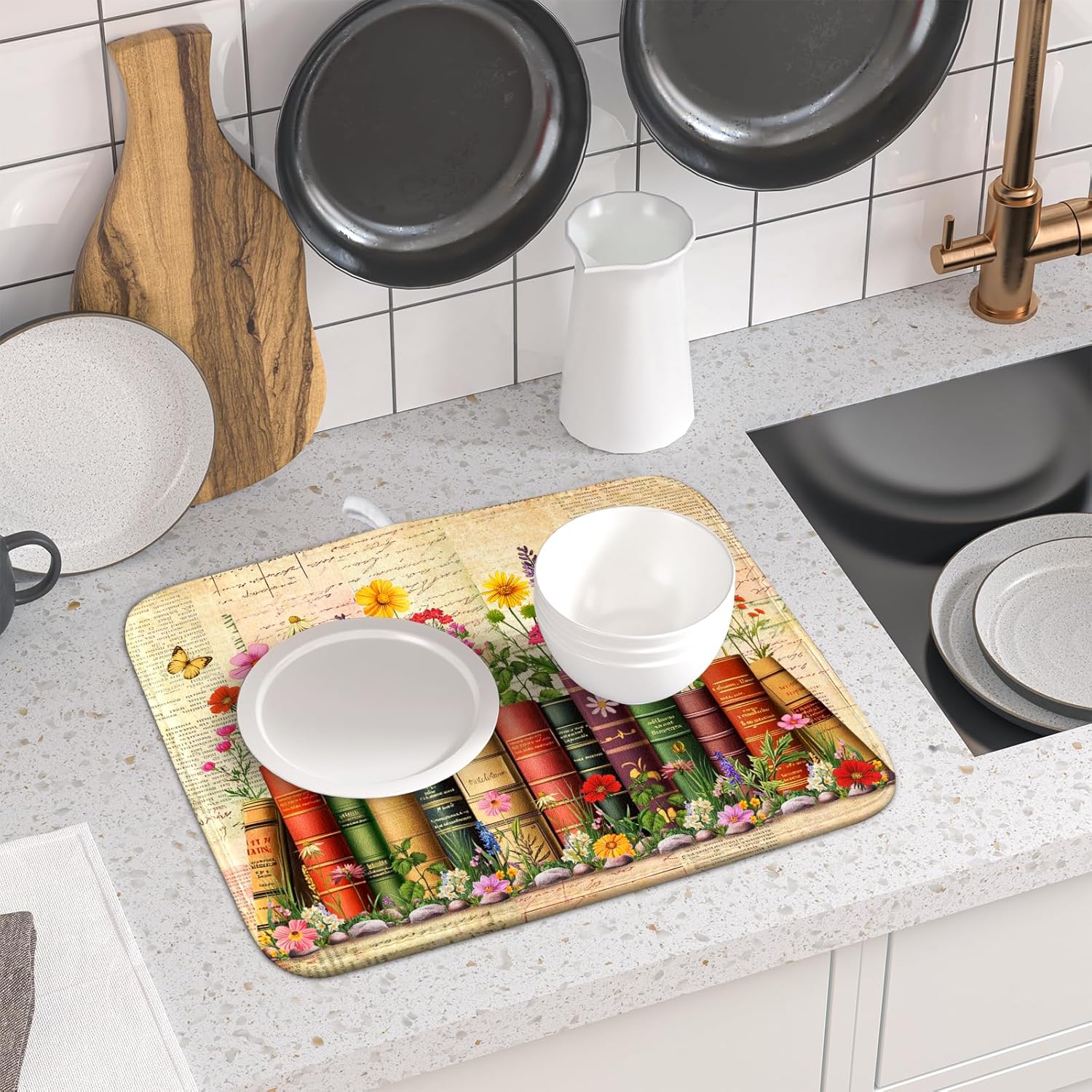 - Material: The books dish drying pad's surface is made of polyester, with a composite sponge material in the middle, which can quickly absorb water. The colorful floral drying kitchen mat protects your counter from scuffs and scratches while also keeping your most prized glassware safe and sound