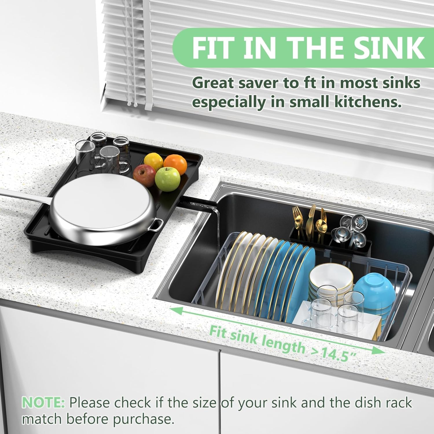 LEMIKKLE Sink Dish Drying Rack - Expandable Small Dish Rack Over Sinks with Drying Tray, Dish Drainer for Kitchen Counter with Cutlery Holder, Drying Rack Fit for 14’’-19’’ Kitchen Sink