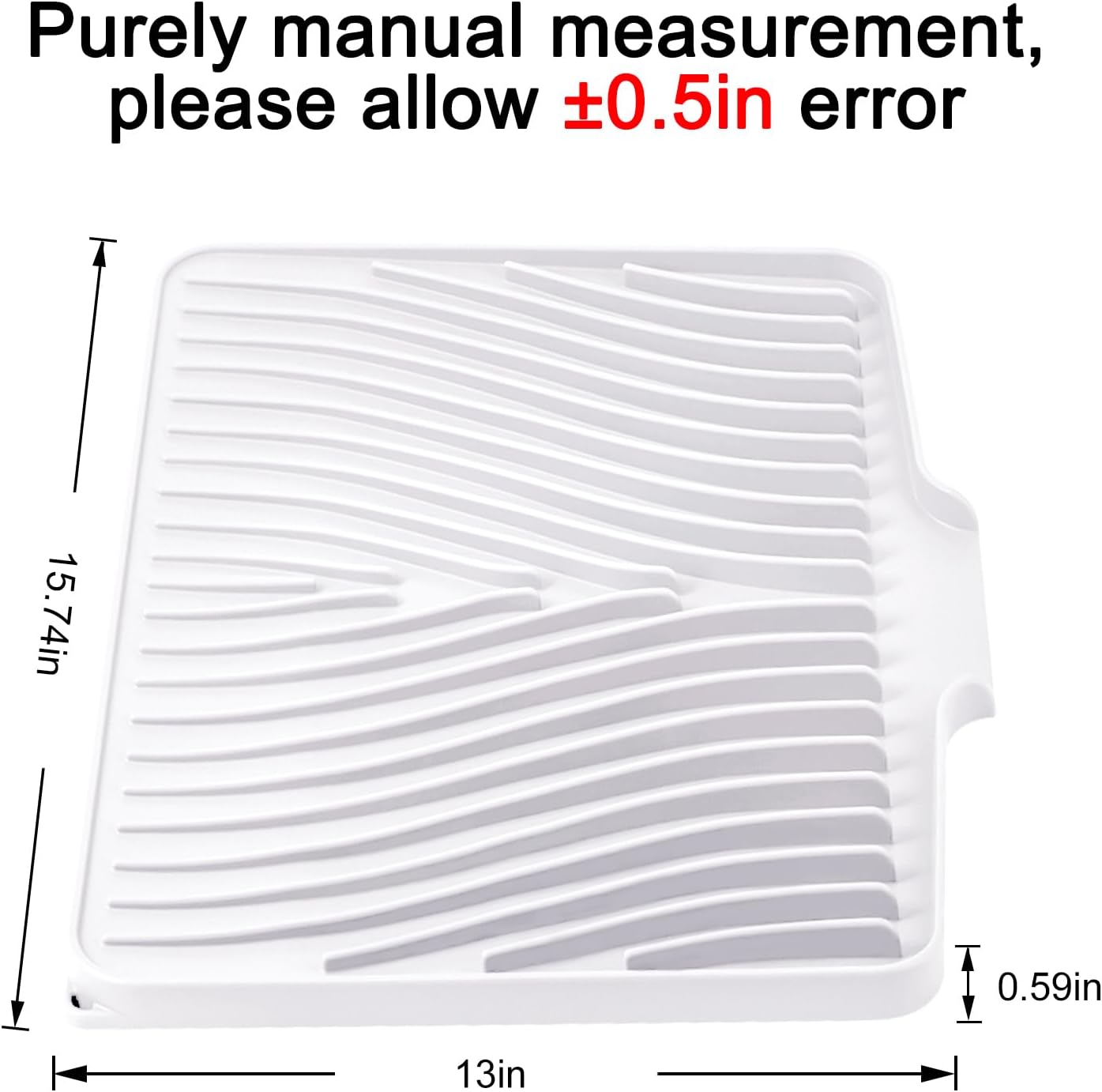 - Quick Drying Mat: TIKNIK dish drying mat measures 15.8" x 13", where washed dishes can be placed for air drying. The folding, raised and innovative design of the quick dry dish mat allows air to circulate under the dishes,and features unique diagonal ridges to easily remove moisture, and a specially designed rim that lets water drain directly into the sink. This keeps your countertops dry and clean, and says goodbye to wet countertops.